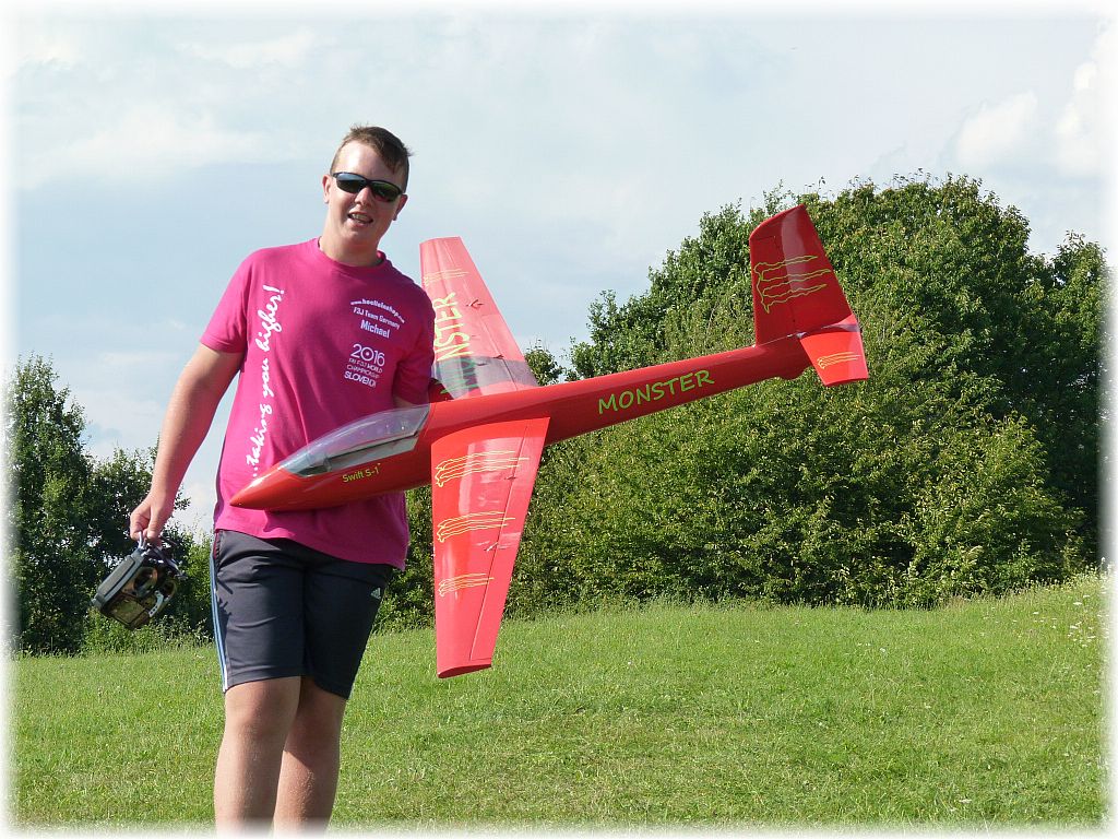 Die Waldlichtung ist im Vergleich zur Gleitschirmfliegerschneise mehr nach Westen ausgerichtet und hat für Shooter und Minirock besser getragen, aber es trug vor allem thermisch. Ich hab noch 2 Stunden lang einige schöne Flüge gemacht und bin immer freiwillig gelandet, nicht weil es keinen Aufwind mehr hatte. Dabei waren ein mal 5 Bussarde lange im selben Bart wie der Shooter und der Minirock hat in einem Pulk Schwalben seine Thermikflugqualitäten gezeigt, auch ein Bussard konnte ihn nicht abhängen nachdem ich noch mal Blei aus der Nase genommen hatte, das Grinsen davon hab ich immer noch im Gesicht