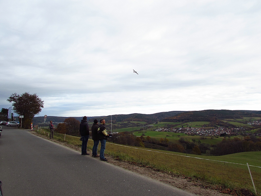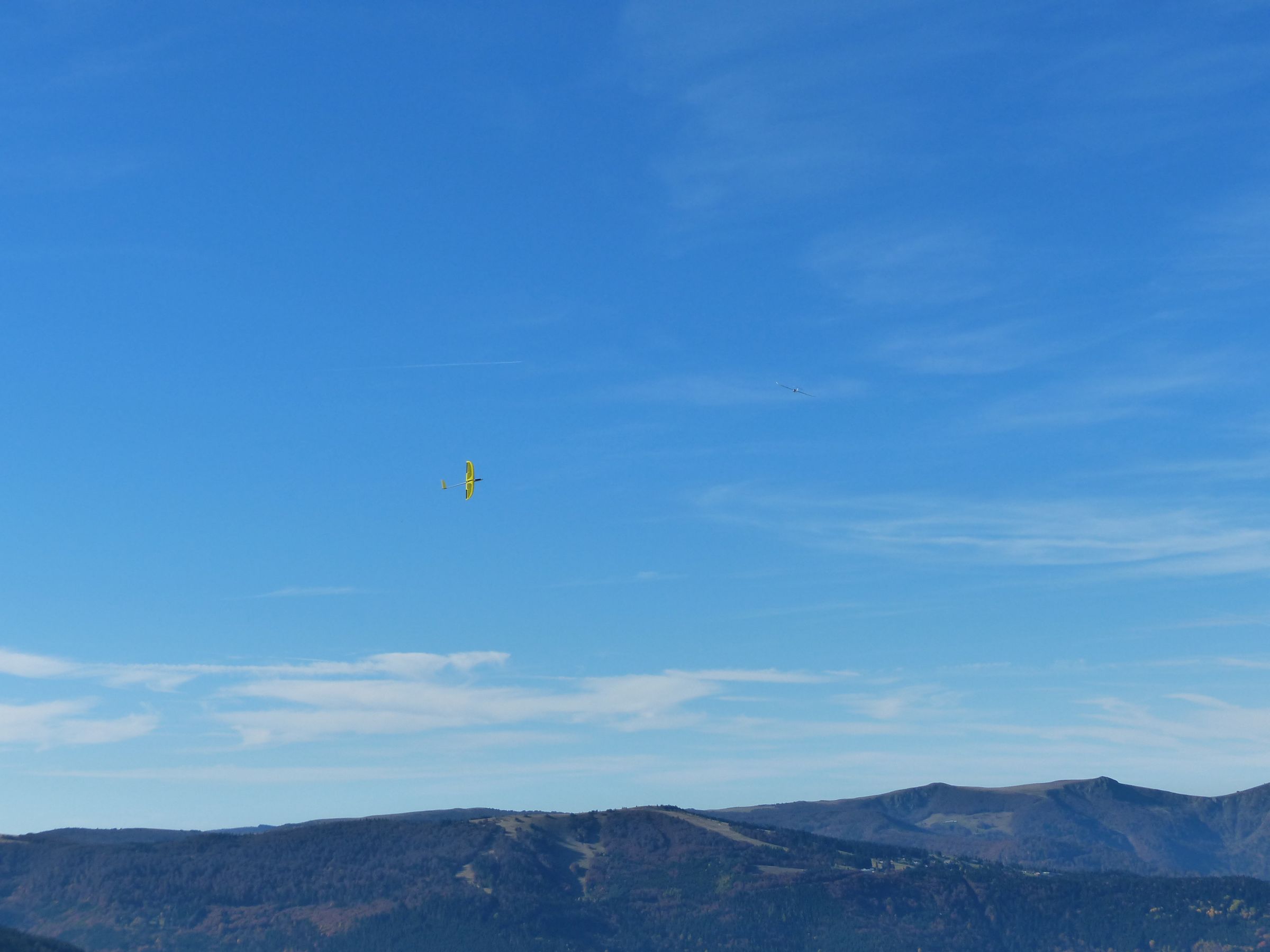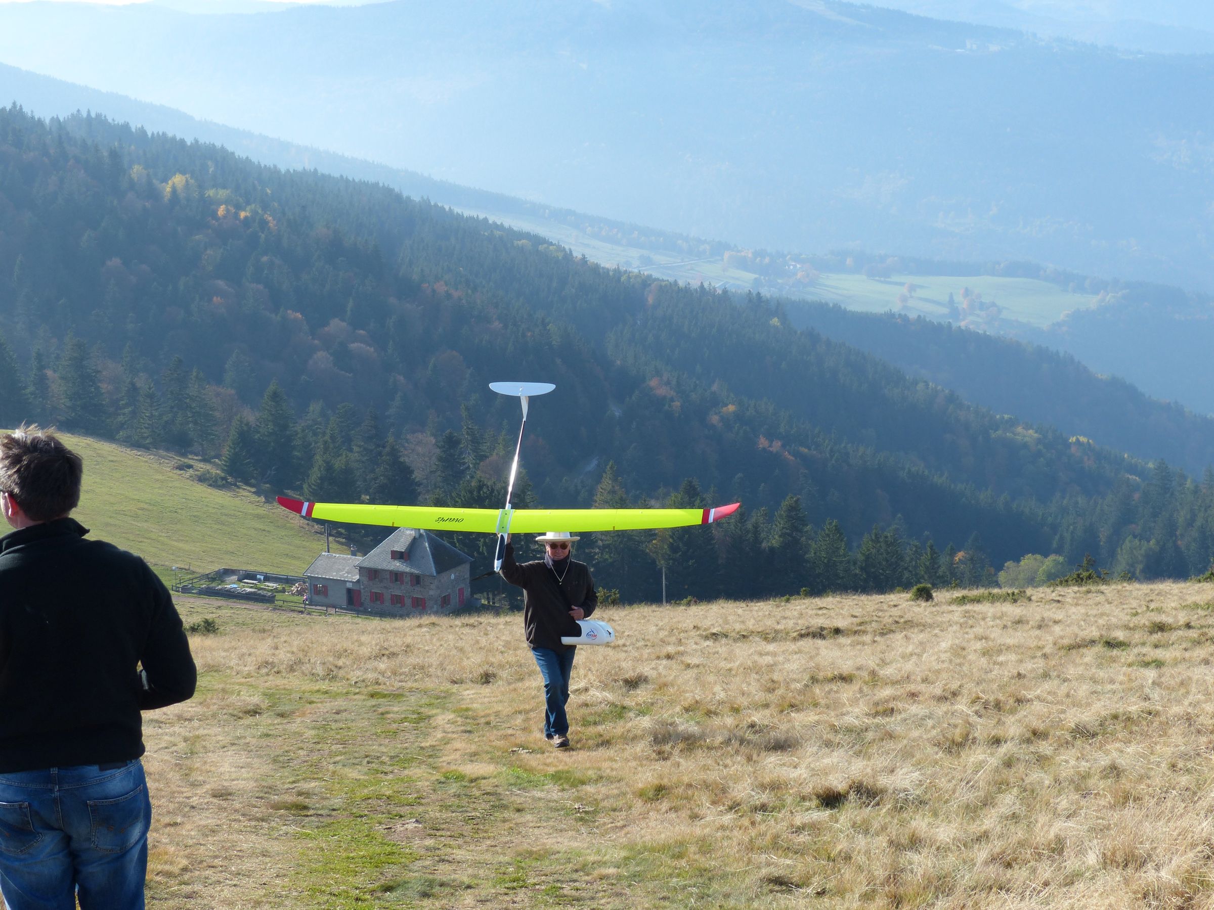 Gestern, 28.10. haben wir es endlich wahr gemacht und sind zu dritt zum Petit Ballon ins Elsass gefahren. Ich war nicht zum ersten Mal dort, aber diesmal wollte ich auch fliegen. Mein Kollege Michael und Stephan waren mit an Bord. Das Wetter sollte sonnig mit Temperaturen um 12-13 Grad und leichtem Wind aus N bis NO werden. Als wir gegen 12.00 Uhr ankamen, waren wir zunächst alleine und konnten uns ausbreiten, allerdings kam der leichte Wind mehr aus NW bis W, also nicht mit Blick ins Rheintal, dass komplett mit Nebel bedeckt war, sondern in Richtung Geradmer. Der Landeplatz ist auf dieser Seite auch nicht ganz so groß und eben wie in Richtung Rhein. Wir hatten unsere Segler, auch mit Motor (Uwe mag es verzeihen) nach oben "geschleppt" und gegen 12.00 Uhr zügig dem Wind und der leichten Thermik übergeben. Dabei waren ein PasserX, ein Phoenix2000 (wegen Reglerausfall nicht geflogen), ein Walross von HK, mein arthobby Evolution der zum ersten Mal am Hang war, ein arthobby Skua und Schaumkleinzeug zum spielen. Wir waren nicht lange dort, als Michel mit seinem Avatar-Mix (ein bischen oddissey war dabei) ankam. Später noch ein Paar aus dem Kölner Raum die das Wochenende im Eslass verbrachten und dort nicht das letzte Mal waren. Um es auf den Nenner zu bringen, ein super Tag mit viel Spaß, Staunen (der Franzose Michel-auf den Bilder mit weißem Hut) hat es voll drauf. Sein Avatar kam gar nicht mehr zu Boden. Wie Michel entlang des gesamten Hangs, später bis über die Kuppe in Richtung Rhein jede Windbewegung ausnutzte und seinen Flieger in extreme Höhe brachte, war ein Genuss. Auch der Gast aus dem Rheinland, er möge verzeihen, dass ich nicht nach dem Namen gefragt hatte, zeigte uns wie man am Hang extrem soaren kann. Später brachte er den "Falken" geflogen ins Tal, was Michel im Übrigen ebenfalls beim Abstieg machte. Platz zum landen gibt es genug. Wir werden mit Sicherheit wieder zum Petit fahren (ca. 1 Stunde 15 Minuten von Freiburg aus).