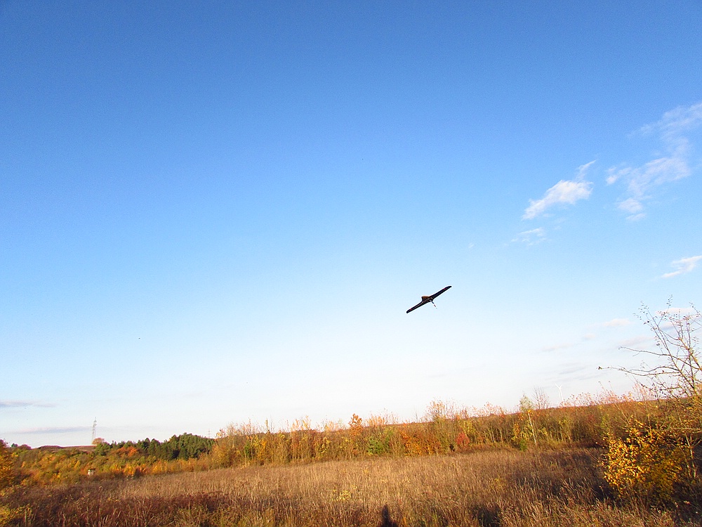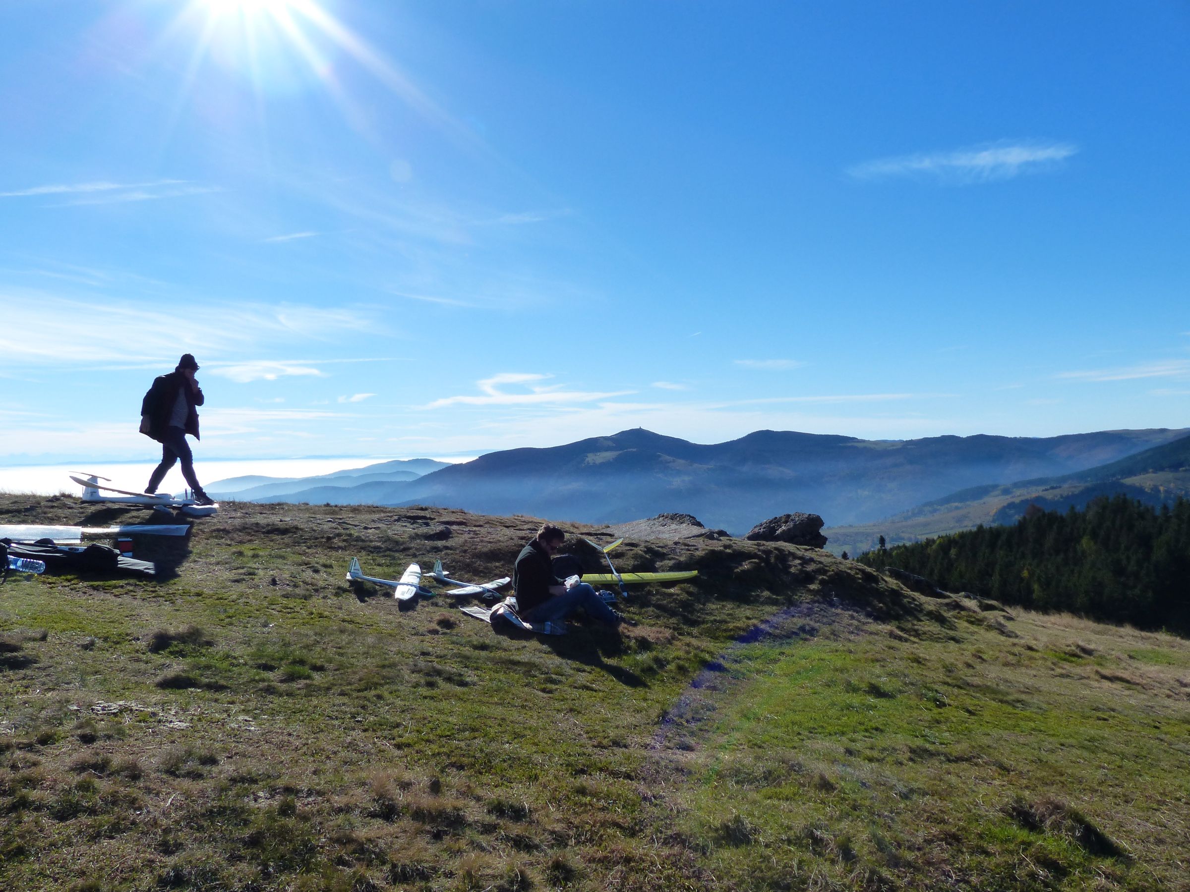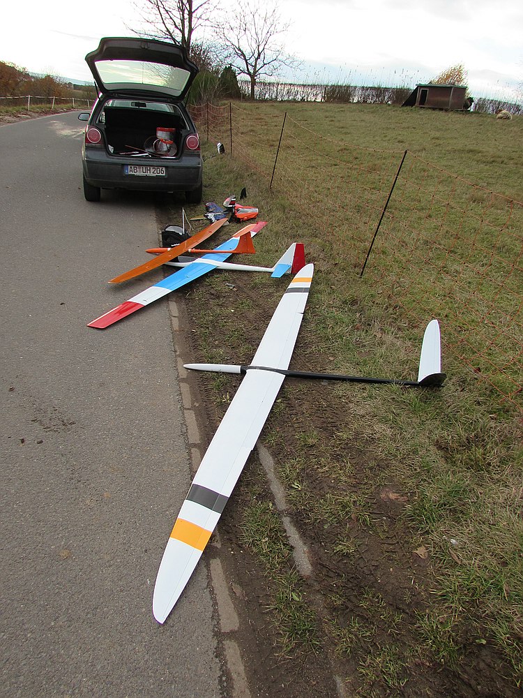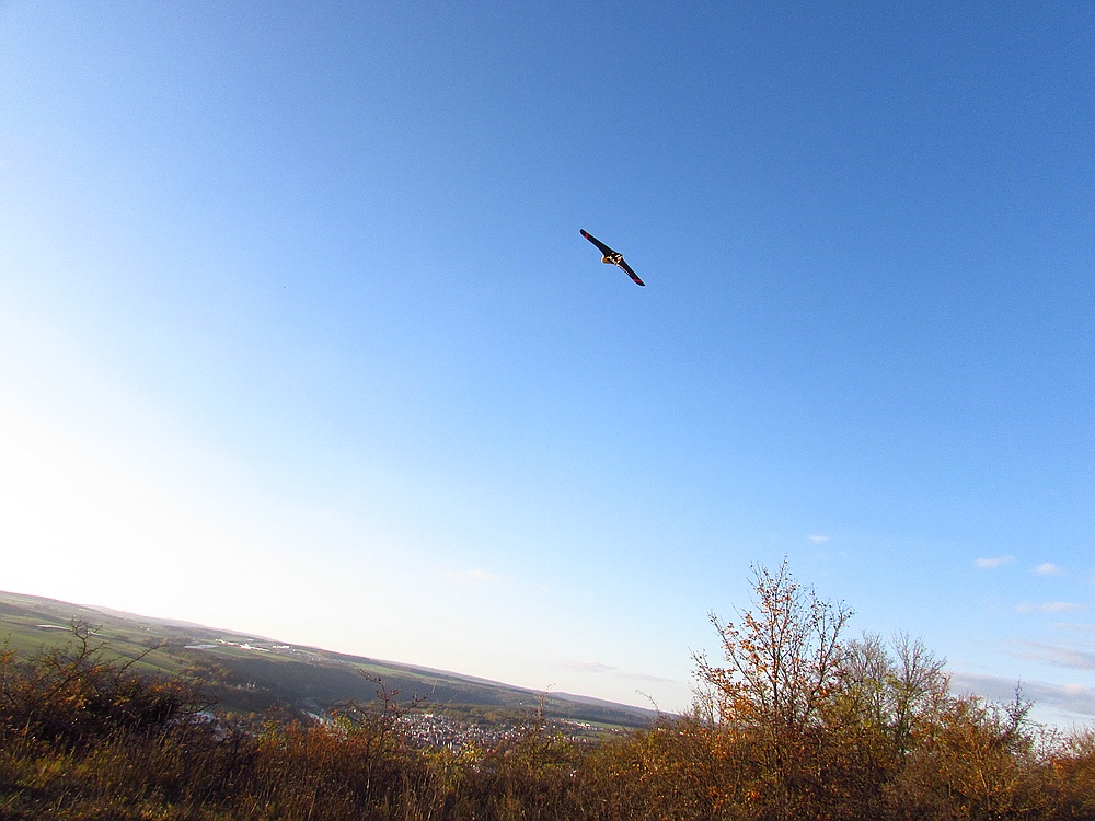 Gestern, 28.10. haben wir es endlich wahr gemacht und sind zu dritt zum Petit Ballon ins Elsass gefahren. Ich war nicht zum ersten Mal dort, aber diesmal wollte ich auch fliegen. Mein Kollege Michael und Stephan waren mit an Bord. Das Wetter sollte sonnig mit Temperaturen um 12-13 Grad und leichtem Wind aus N bis NO werden. Als wir gegen 12.00 Uhr ankamen, waren wir zunächst alleine und konnten uns ausbreiten, allerdings kam der leichte Wind mehr aus NW bis W, also nicht mit Blick ins Rheintal, dass komplett mit Nebel bedeckt war, sondern in Richtung Geradmer. Der Landeplatz ist auf dieser Seite auch nicht ganz so groß und eben wie in Richtung Rhein. Wir hatten unsere Segler, auch mit Motor (Uwe mag es verzeihen) nach oben "geschleppt" und gegen 12.00 Uhr zügig dem Wind und der leichten Thermik übergeben. Dabei waren ein PasserX, ein Phoenix2000 (wegen Reglerausfall nicht geflogen), ein Walross von HK, mein arthobby Evolution der zum ersten Mal am Hang war, ein arthobby Skua und Schaumkleinzeug zum spielen. Wir waren nicht lange dort, als Michel mit seinem Avatar-Mix (ein bischen oddissey war dabei) ankam. Später noch ein Paar aus dem Kölner Raum die das Wochenende im Eslass verbrachten und dort nicht das letzte Mal waren. Um es auf den Nenner zu bringen, ein super Tag mit viel Spaß, Staunen (der Franzose Michel-auf den Bilder mit weißem Hut) hat es voll drauf. Sein Avatar kam gar nicht mehr zu Boden. Wie Michel entlang des gesamten Hangs, später bis über die Kuppe in Richtung Rhein jede Windbewegung ausnutzte und seinen Flieger in extreme Höhe brachte, war ein Genuss. Auch der Gast aus dem Rheinland, er möge verzeihen, dass ich nicht nach dem Namen gefragt hatte, zeigte uns wie man am Hang extrem soaren kann. Später brachte er den "Falken" geflogen ins Tal, was Michel im Übrigen ebenfalls beim Abstieg machte. Platz zum landen gibt es genug. Wir werden mit Sicherheit wieder zum Petit fahren (ca. 1 Stunde 15 Minuten von Freiburg aus).