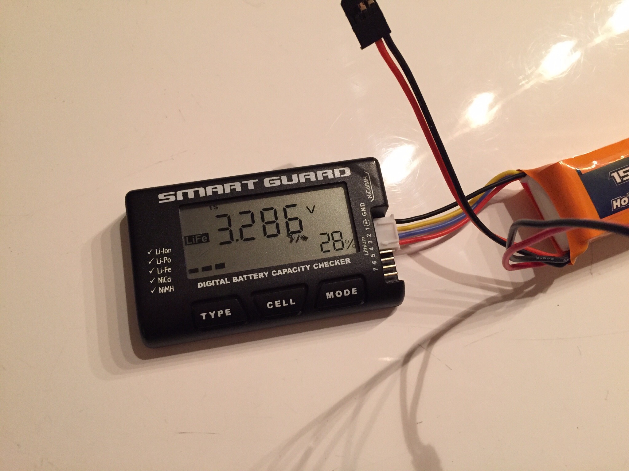 Ich habe mir dann gleich mal meinen LiPo-Checker geschnappt und an den Balanceranschluss gesteckt, aber seht selbst: