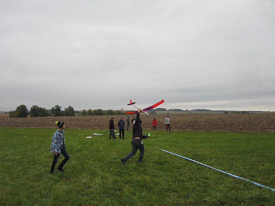 Kurze Zusammenfassung: In der ersten Runde konnten trotz 8/8 Bewölkung und bei schwachem Ostwind die 6 Minuten gut voll geflogen werden, aber im Laufe des Wettbewerbs wurden die durchschnittlichen Flugzeiten immer kürzer, das Tröpfeln kam immer öfter und das Fly Off fand dann nach umdrehen der Startrichtung für den auf West gedrehten Wind im Regen statt.