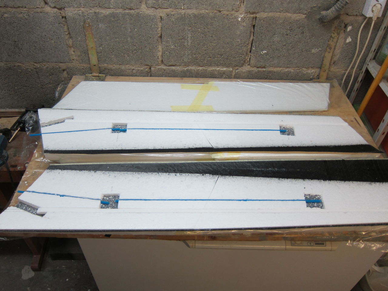 habe den Marumba mal für die nächste "Saufparty" vorbereitet und Sangria-Röhrlen verlegt. Und Depronstege ausgeschnitten und zugeschliffen, um sie als Holmkern dann als übernächstes mit Glasschlauch zu beziehen.