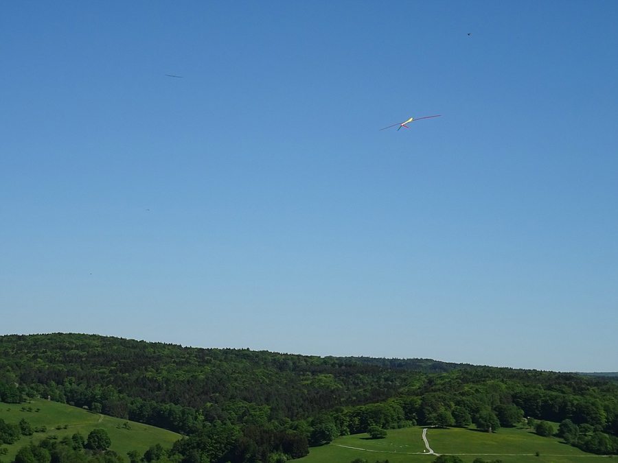 Zunächst kam die personentragende DG 1000 "Schloß Johannisburg" übern Pfaffenberg und dann kam tatsächlich eine Phase von etwa 20 Minuten mit schwachen Abendthermik-Ablösungen, die aber für meinen Shooter reichte um das Spessartsegler-Pflichtprogramm und ein bisschen mehr zu fliegen