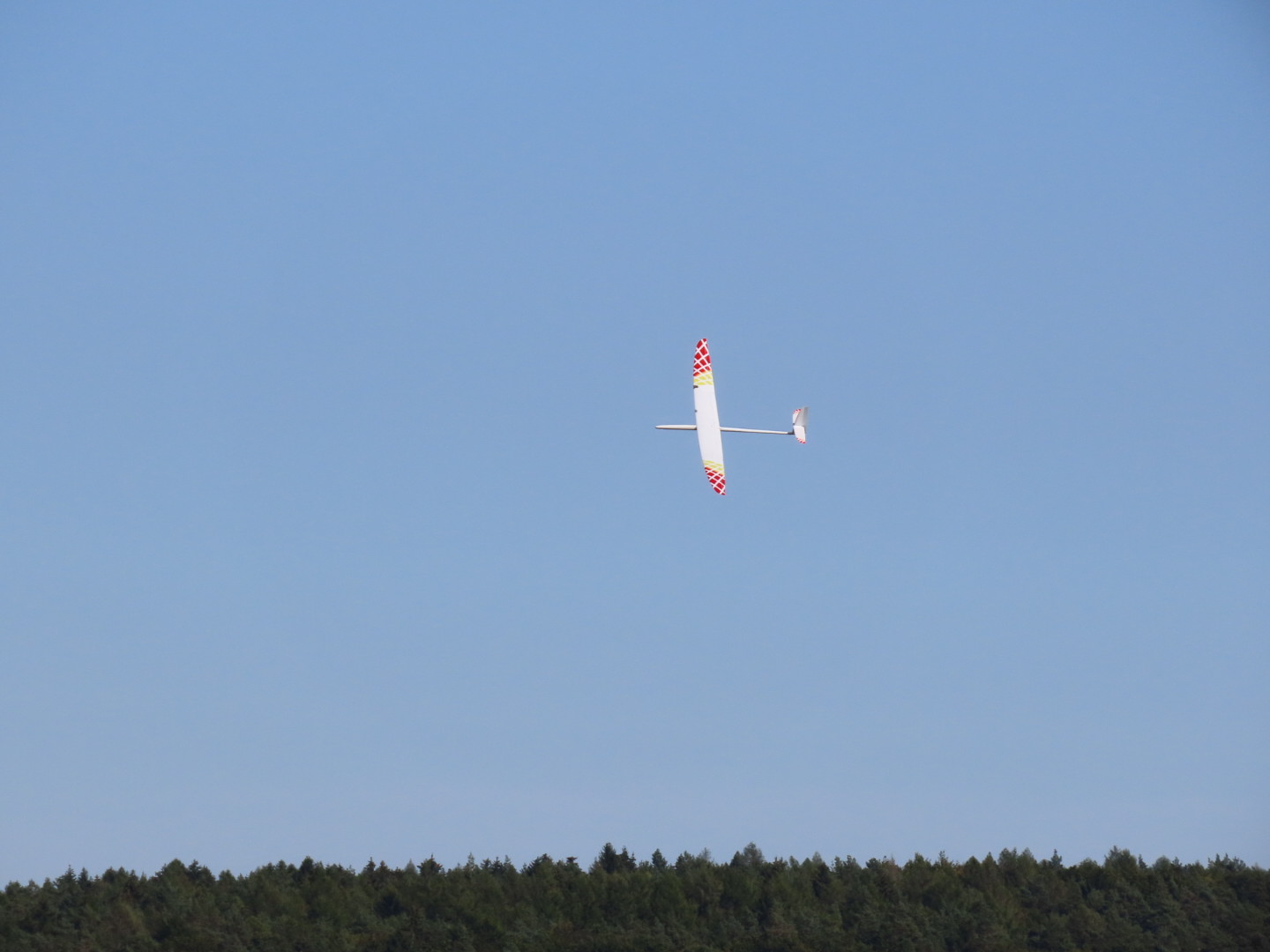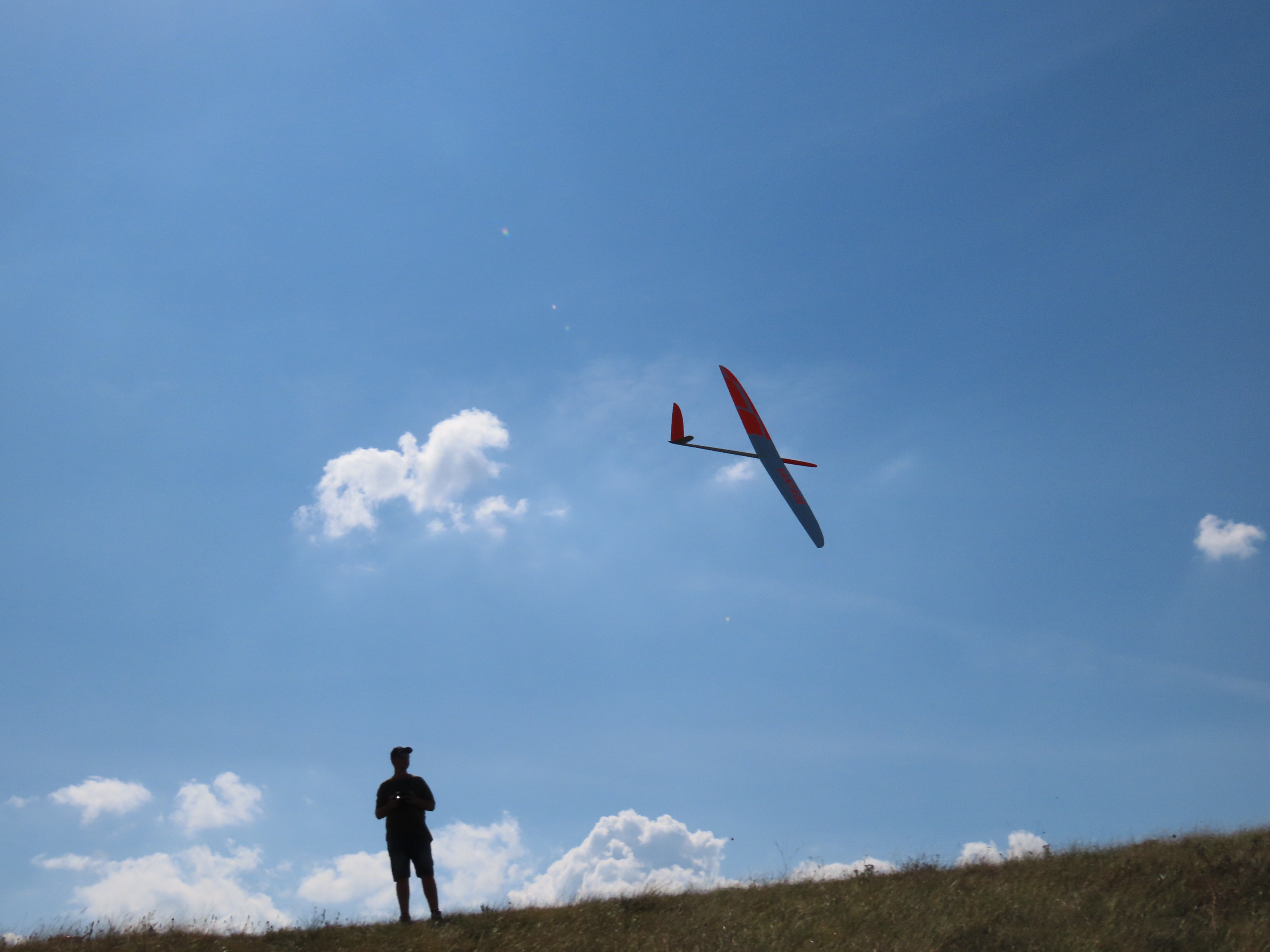 Wind war leider ein bisschen von links, deshalb war es zeitweise vor und hinter dem Hang etwas bockig, aber in einer einzigen guten Phase des späten Nachmittags mit auffrischendem Wind von guten 4 bft direkt von vorne hatte ich diesmal Glück gerade mit dem Lilloo in der Luft und Uwe mit der Gun am Boden zu sein, dadurch hat es mit einem "echten" Airframe-Rekord für den Lilloo geklappt......so richtig mit Gun auf den Flieger halten statt Stativmessung und Sportzeuge an der Gun und relativ schnell für 76 cm Spannweite, 253 Gramm und 30 g/dm² Flächenbelastung :)
