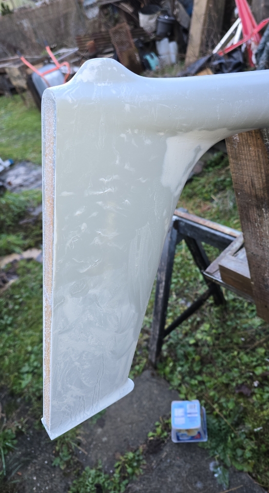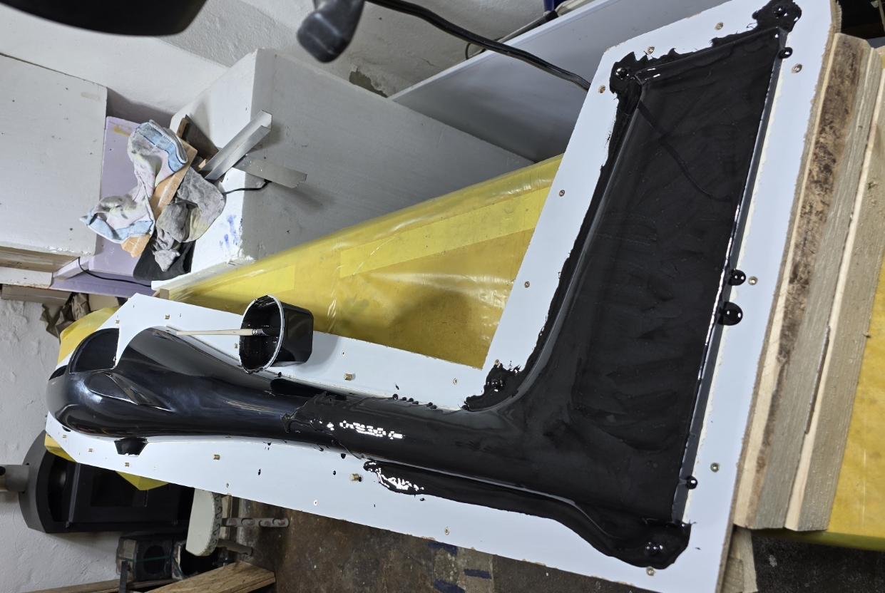 Es hatte Temperaturen so ganz knapp im Plusbereich. Orangenhaut hat's trotzdem gegeben, aber ist ja nur das Urmodell, das wird dann morgen alles nass glattgeschliffen.