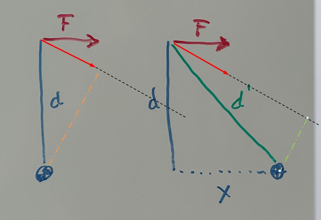 Schnell mal ne Skizze gemacht: da siehst de den Zusammenhang. Je weiter hinter dem Schwerpunkt, desto grösser wird der neue Hebelarm d´und damit das Kippmoment oder Drehmoment oder Nickmoment um den Schwerpunkt, wenn d und F identisch bleiben.