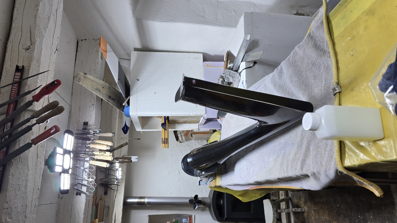 ...eben das Urmodellchen mit Mipa PUR 250-90 Schwarz lackiert am Galgen im Hof. Jetzt darf der kleine über dem ordentlich eingeheizten Ofen aushären bis Morgen. Da hoffe ich dann, ist alles schon so perfekt hart, damit ich mit dem Nassschleifen und Polieren weitermachen kann.