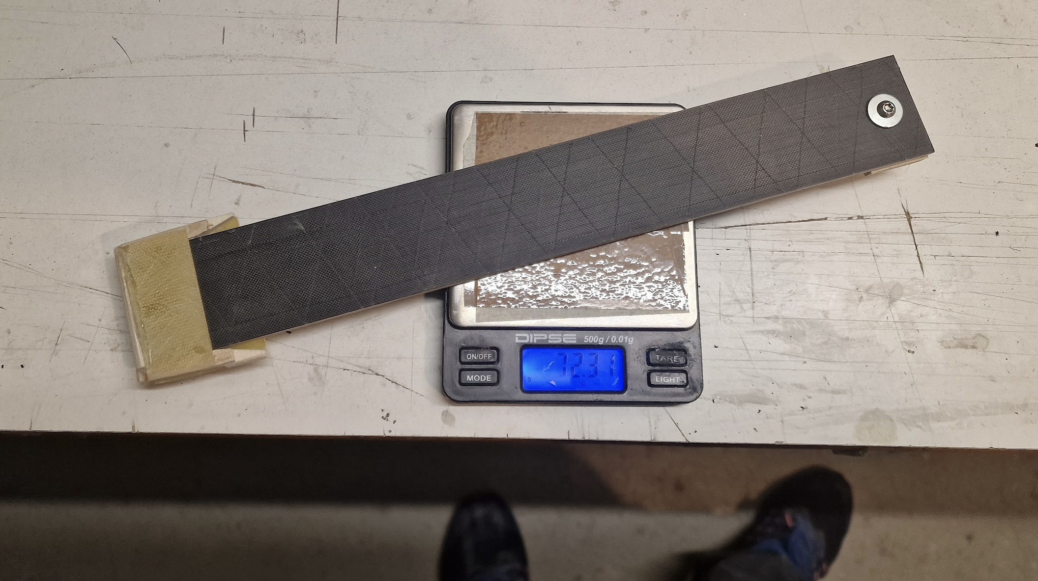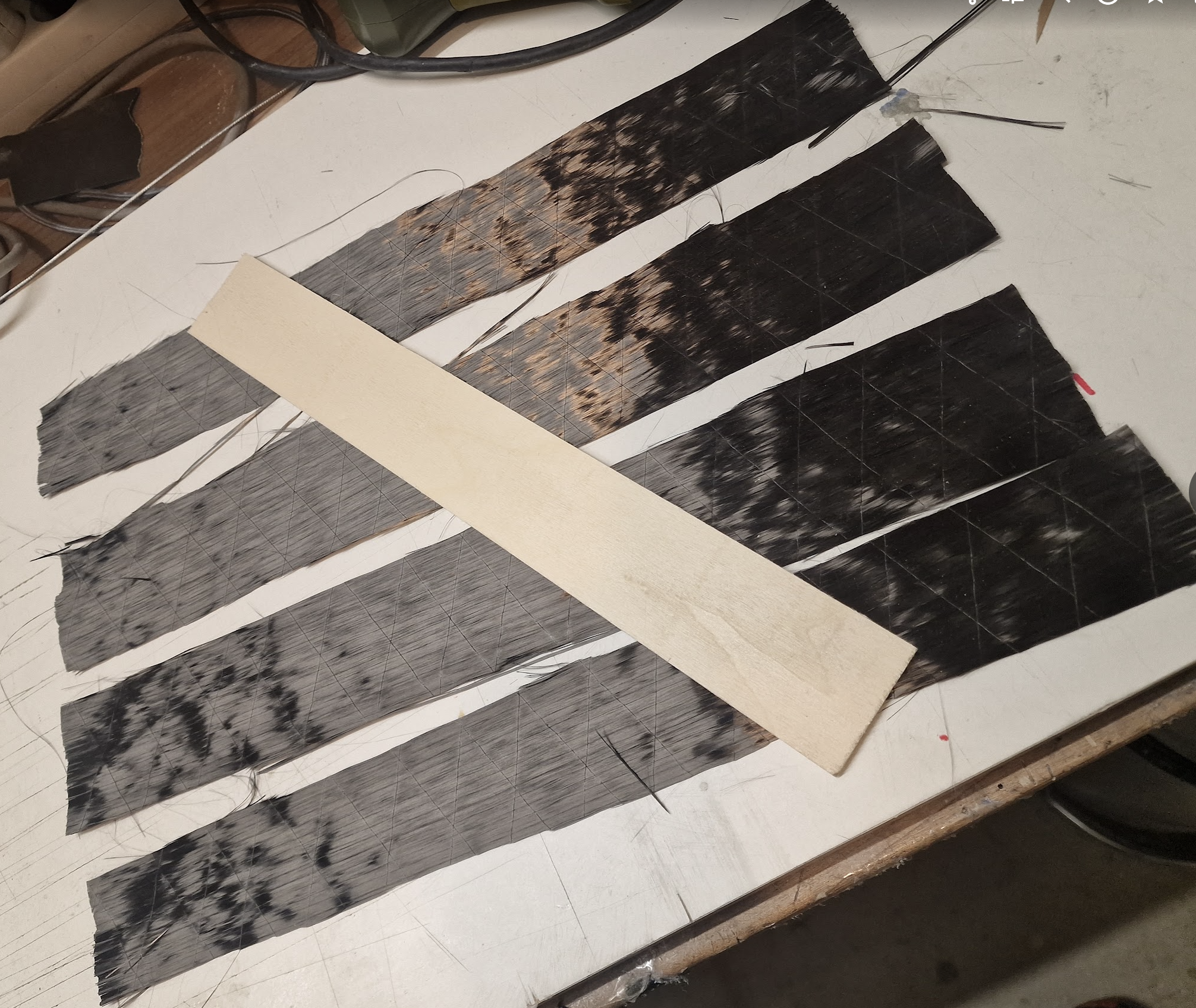 Das HR ist fertig verschliffen und mittig getrennt. Gewicht war, mit noch geschlossener Scharnierlinie, 119g. Die Torsionssteifigkeit ist irre. Da kann ein Schalenleitwerk nicht mithalten...