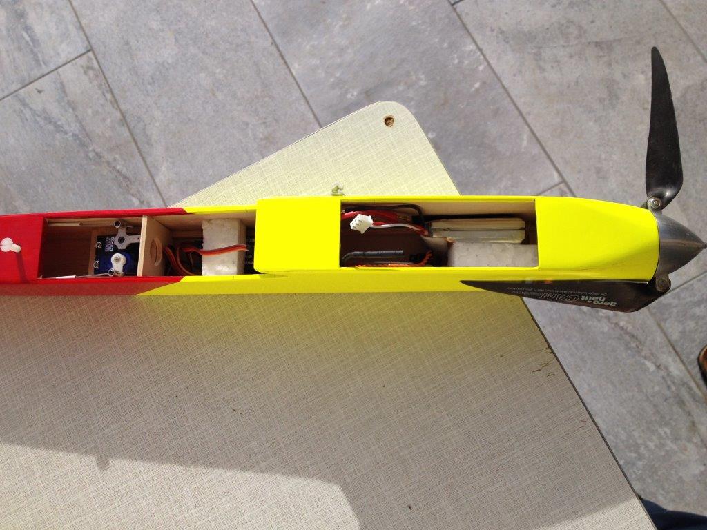 Die Anordnung der Komponenten ist bei mir ähnlich, nur sitzt der HOTT Gr12 bei mir noch hinter dem Empfänger, weil ich schwerere 3S-Akkus fliege. Berichte mal, wie es sich mit der 2S Motorisierung fliegt, ich überlege gerade auch den Antrieb umzustellen um noch etwas Gewicht zu sparen.
