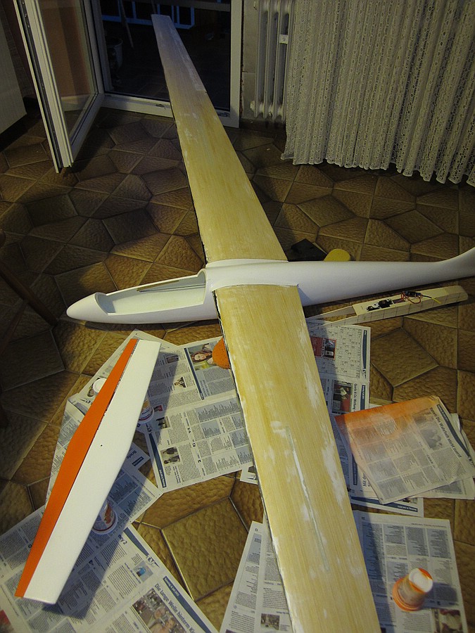 die Beschichtung mit Parkettlack mach ich weil es in mehreren Schichten aufgetragen werden muss um das Gewebe zu füllen, das kommt meinem Arbeitstakt mit den wöchentlichen Dienstreisen entgegen und damit wird immer wieder leicht zwischen geschliffen. Ich erhoffe mir damit eine leichte und glatte faserverstärkte Lackgrundierun, außerdem ist für die Parkettlack nicht so viel Schutzaufwand erforderlich. Ich habe das als Grundierung aber auch noch nie gemacht und bin auf das Ergebnis gespannt, vor allem beim Gewicht. Die Rohgewichte der Flügel habe ich ja, damit kann man nachher vergleichen, ich darf nur nicht vergessen vor dem Farblack noch mal zwischen zu wiegen :roll: