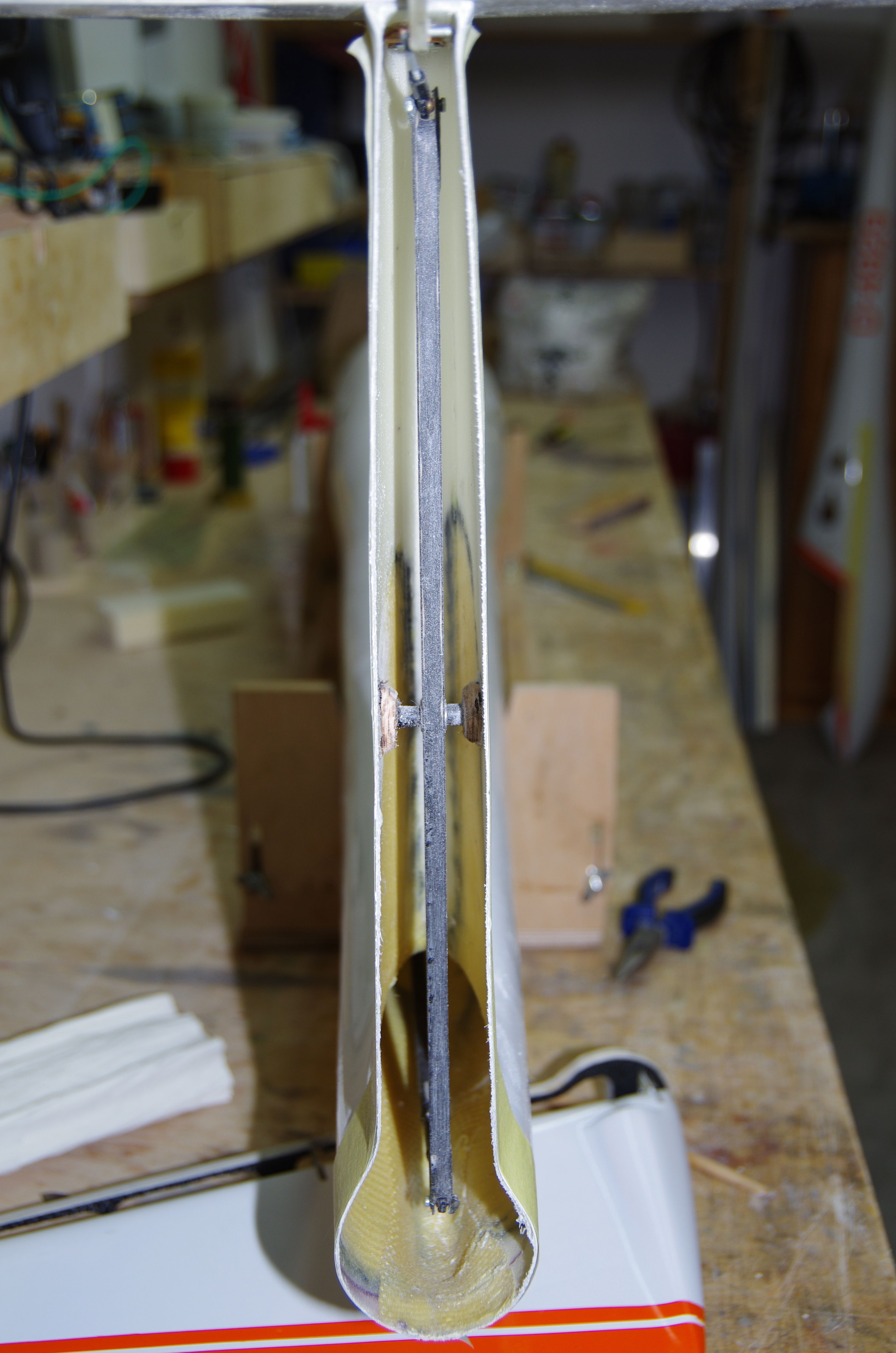 Das einzige, was mir dabei eingefallen ist: Die gesamte Rumpfsektion kam mir reichlich schwer vor. Flugfertiger Rumpf mit Verbinder und Höhenleitwerk 3,4 kg. Die Rumpfschale hatte ca. 1 kg gewogen, was für mich in Ordnung war ..... aber 2,4 kg für Einbauten und Leitwerke war mir ein bisschen viel - das sollte leichter gehen.