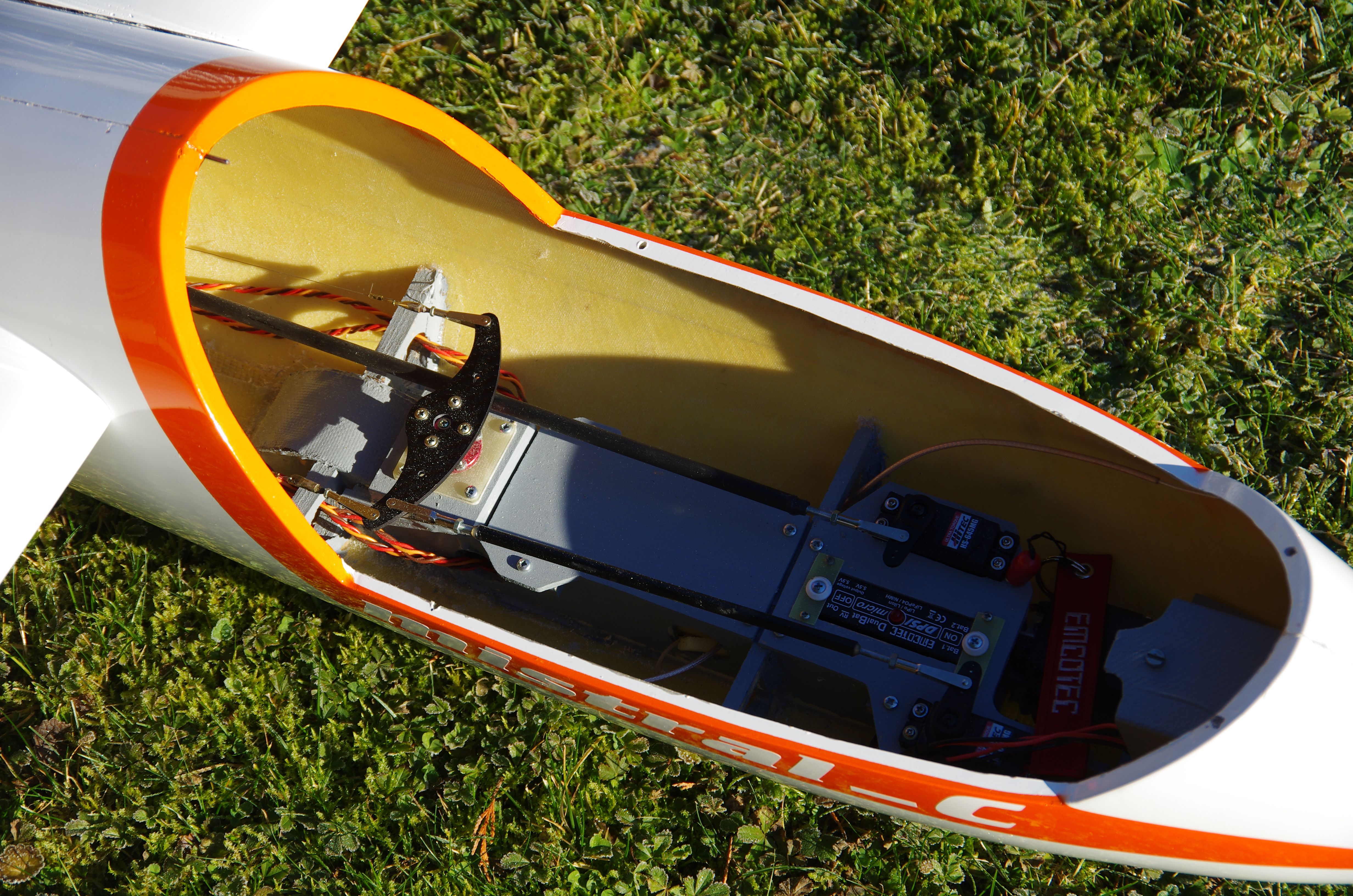 - Alle Einbauten so weit wie möglich nach vorne. Auch das Höhenruderservo wurde nach vorne gesetzt, und die Anlenkung über Kohlerohr und kugelgelagerte Umlenkwippe realisiert: