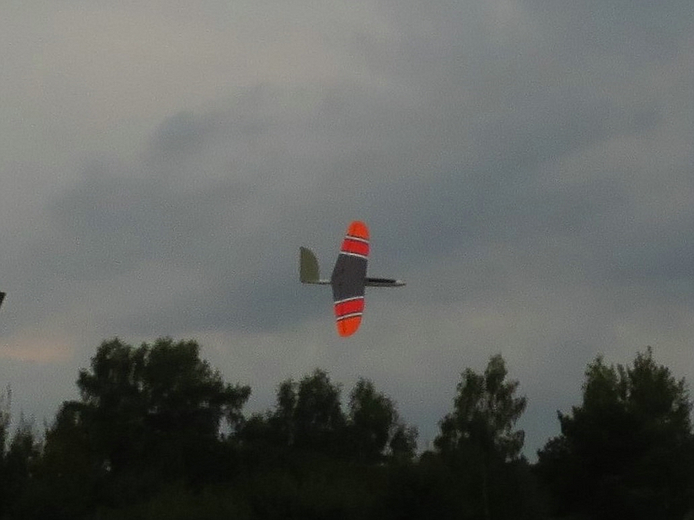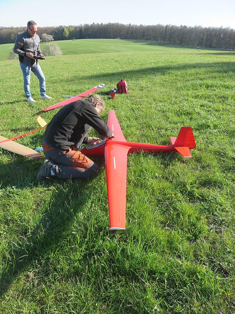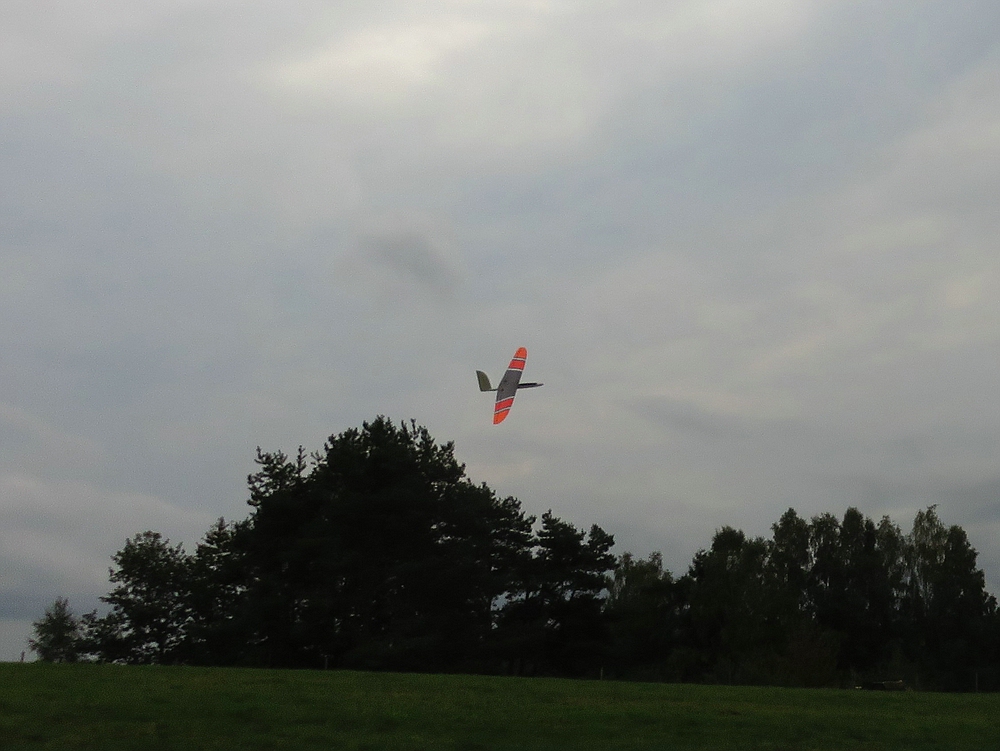 Der Erstflug war dann wegen sehr wenig Wind und dem hohen Gras auf der Wiese am Osthang schwierig. Alleine mit einer Hand und der anderen am Sender am flachen Hang werfen ging gar nicht, die ersten Flitschenstarts mit wenig Zug am Gummi endeten ebenfalls in der hohen Wiese.