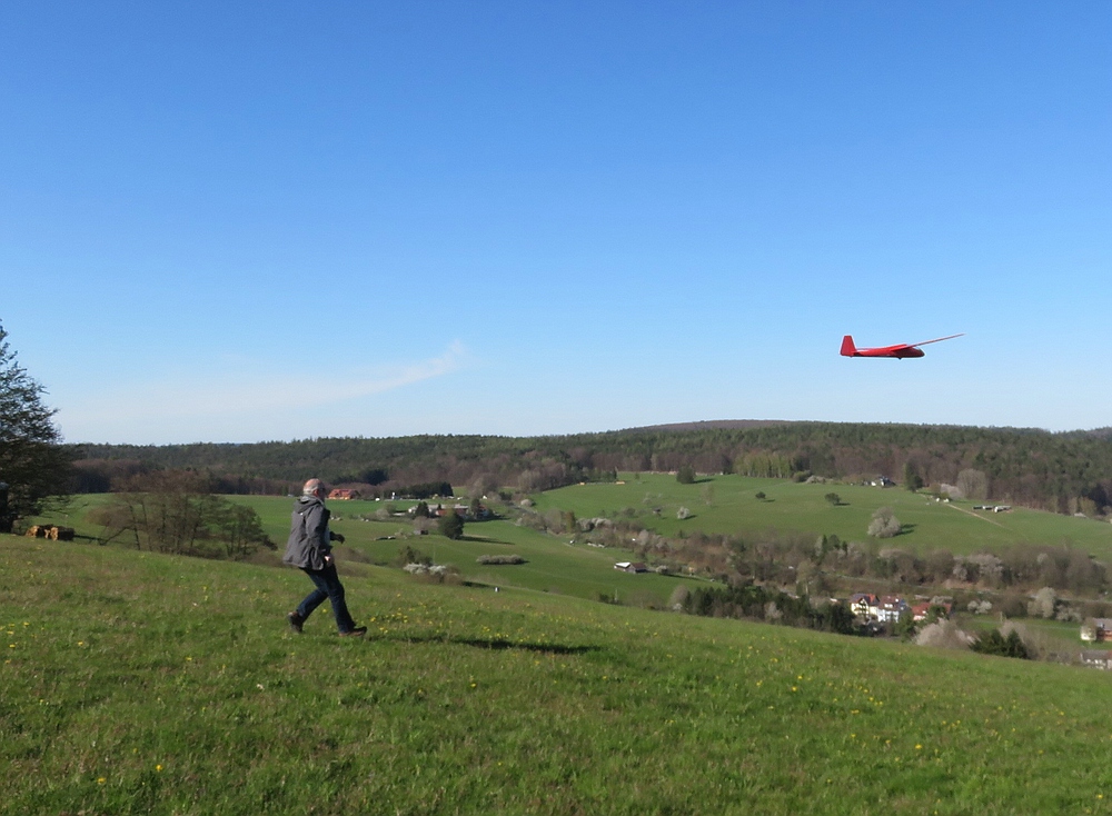 Heute Erstflug von Uwes Oldgliders-Mucha am Osthang. Wegen des schwachen Aufwinds waren nur wenige kurze Flüge und kaum Einstellarbeiten möglich , aber sie fliegt, sieht in der Luft toll aus und kam auch sanft und heil wieder runter
