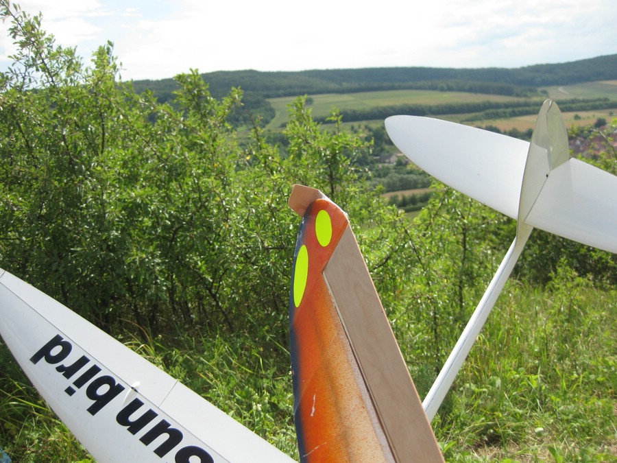 Der Sunbird hat heute stark gelitten, eine Turbulenz hat ihn bei weichen Rudern über den Wald verblasen und als ich ihn wieder in Hangrichtung hatte fehlte ein halber Meter um über die Krone einer 15 m hohen Kiefer weg zu kommen. Bei der Bergung ist mir der Rumpf durchgebrochen, ohne Gewalt hätte ich den Vogel gar nicht aus dem Baum gekriegt.