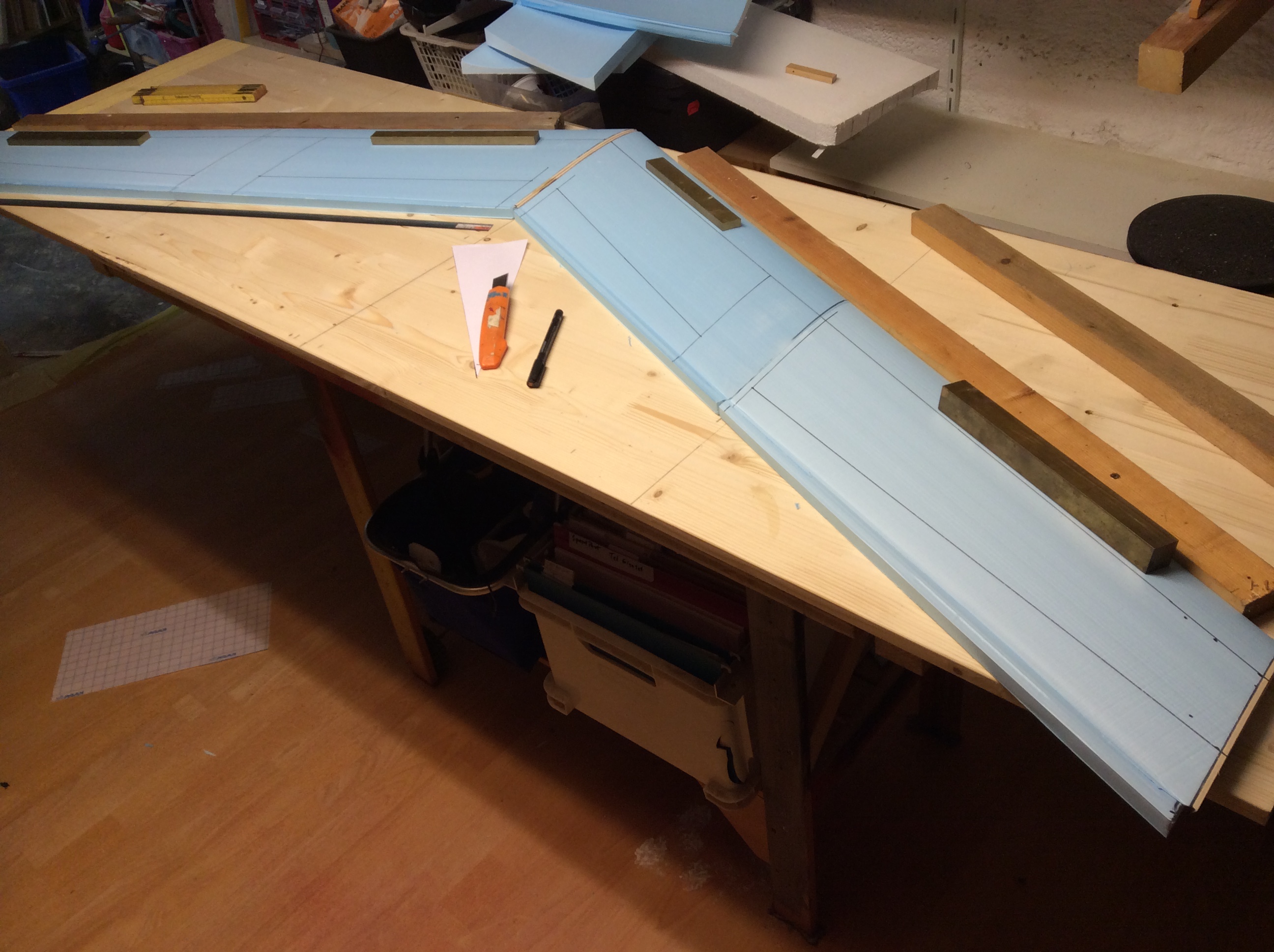 Ich möchte den Marumba bauen, jedoch in 2.50 m und es wird ein Druckantrieb eingebaut. Die Zeichnung von Uwe habe ich daher um den Faktor 1.25 skaliert. Gibt es durch die Vergrösserung noch andere Sachen, die ich berücksichtigen muss? Oder gibt es aus den Erfahrungen der fliegenden Marumbas bereits Änderungen? Die Styrodur Blöcke habe ich bereits zurechtgeschnitten. An Pfeilung und Spannweite kann ich somit nicht mehr gross verrändern.