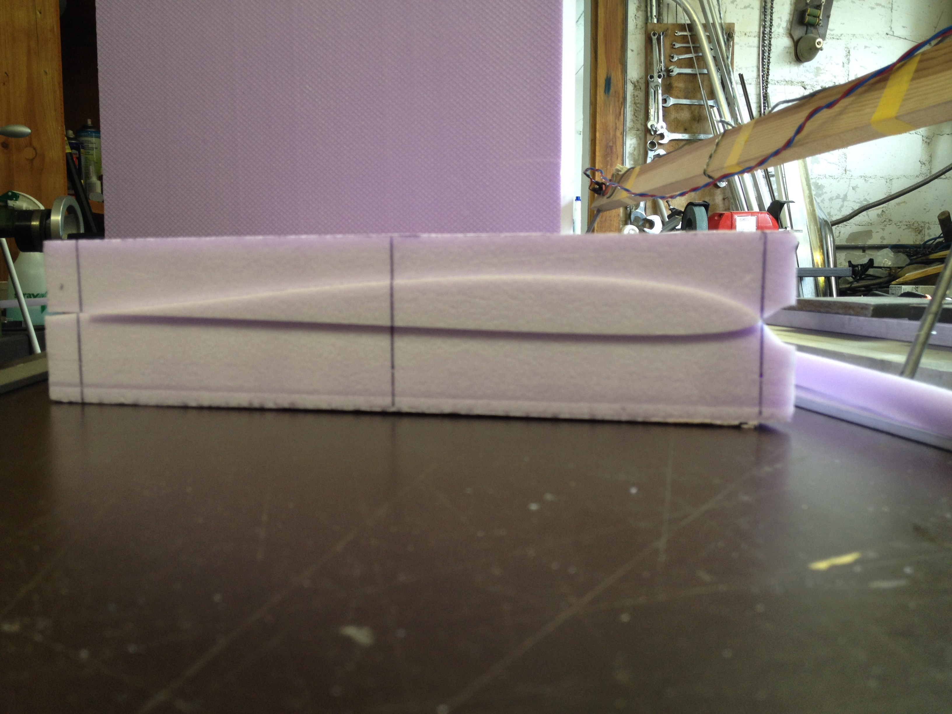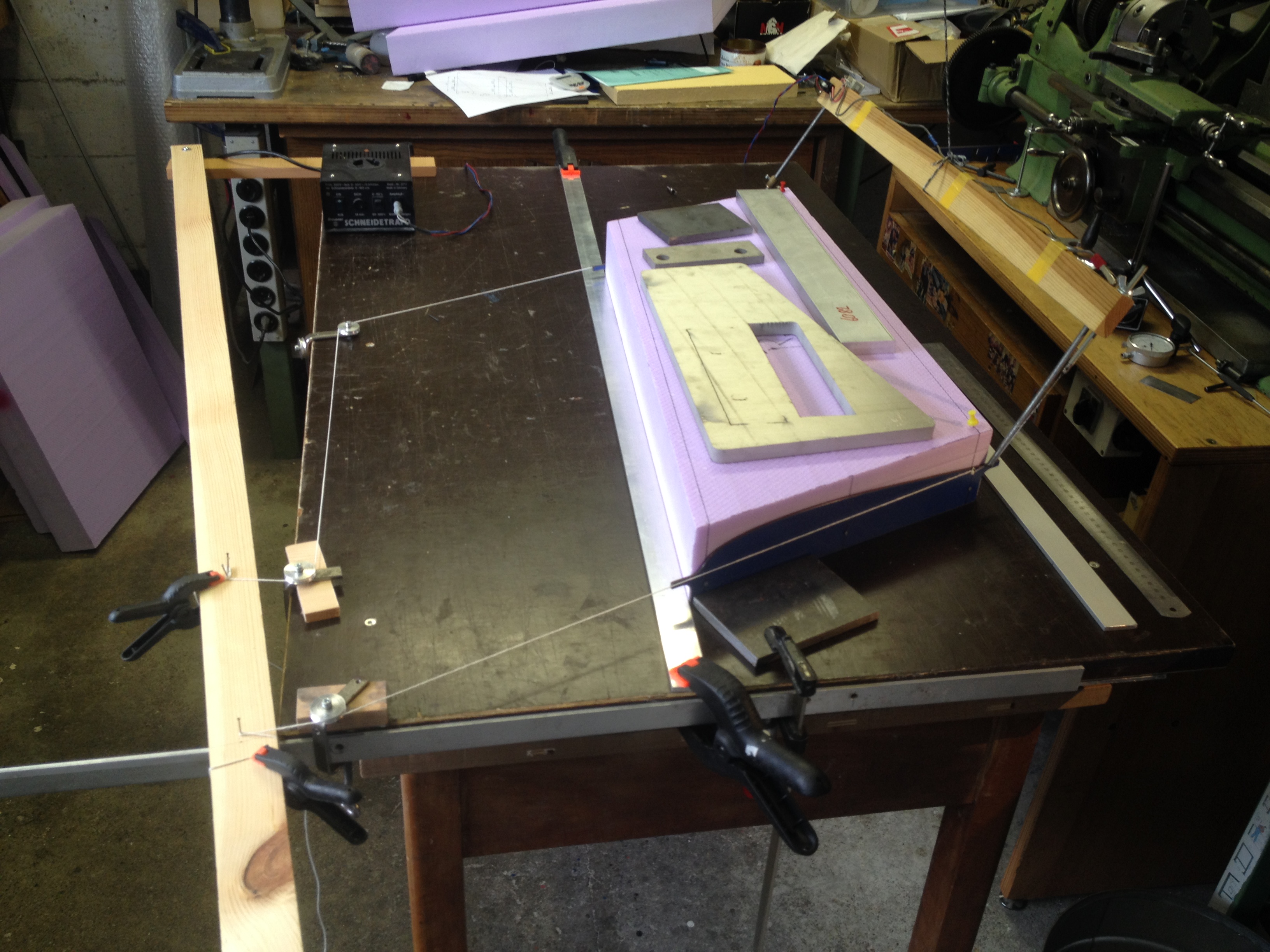 Also die spezielle Form der Schneidschablone hat vor allem zwei Gründe: Erstens bekomme ich auch bei durchhängendem Schneidedraht noch eine gerade Nasenleiste und zweitens habe ich dadurch keine engen Radien, wo der Draht ins Stocken kommen könnte.