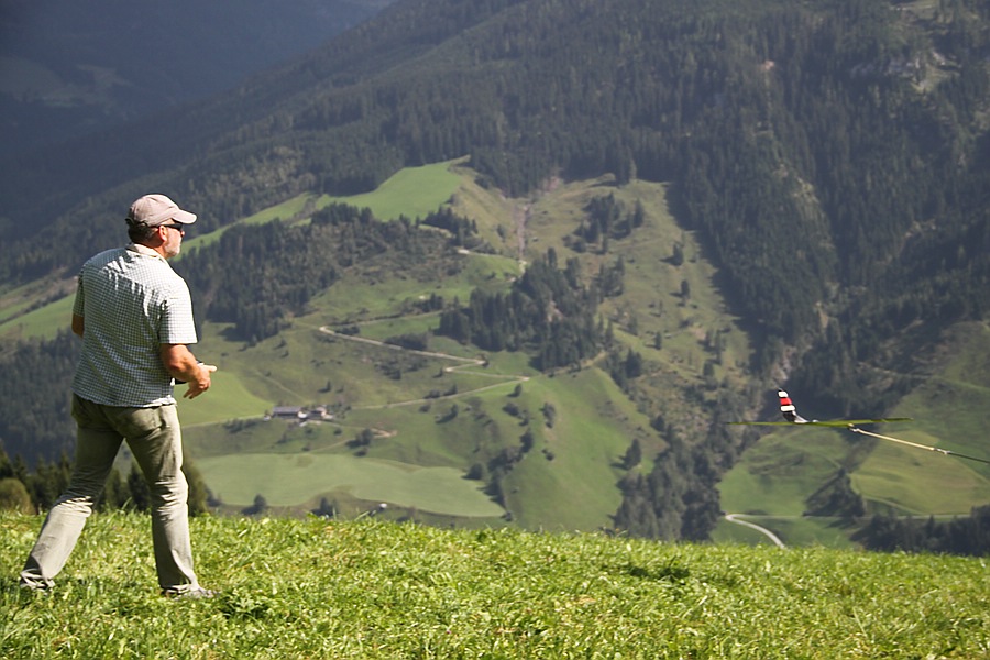 Das ist dort nix für Leute die jeden Tag von der Hotelterrasse aus in einem Pulk von Elektro-Schaummodellen "Hangfliegen" wollen, aber wer mit der Gondel hoch fährt hat 300 m leicht bergauf von der Bergstation einen Startplatz für fast alle Windrichtungen ("Naturplatzl") und wem es nichts aus macht sich zwischen Frühstücksbuffet im familiär geführten Wanderhotel bei Maria und Sepp und dem Thermikbeginn am Berg noch ein bisschen die Füße zu vertreten ist da genau richtig