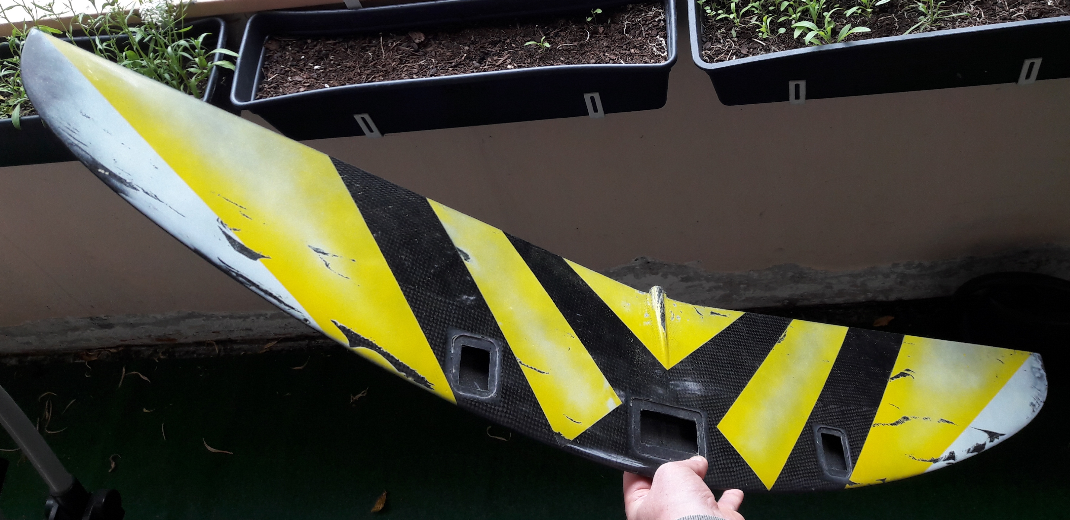 Ich laminiere den Ausleger ganz normal mit und lege links und rechts ca. 15-20mm Streifen ca. 200g Gewebe zum verstärken auf. Der Ausleger selber bekommt einen Roving oben wie unten. In meiner Nr. 1 habe ich aufgedoppelt und dann wieder aufbohren müssen. Wenn ich Vakuum ziehe lege ich nach Abreisgewebe, Breather und Küchenrolle einen kurzen Plastikschlauch in den Ausleger, damit es mir das Gewebe richtig andrückt. Hat bis jetzt immer supper geklappt.