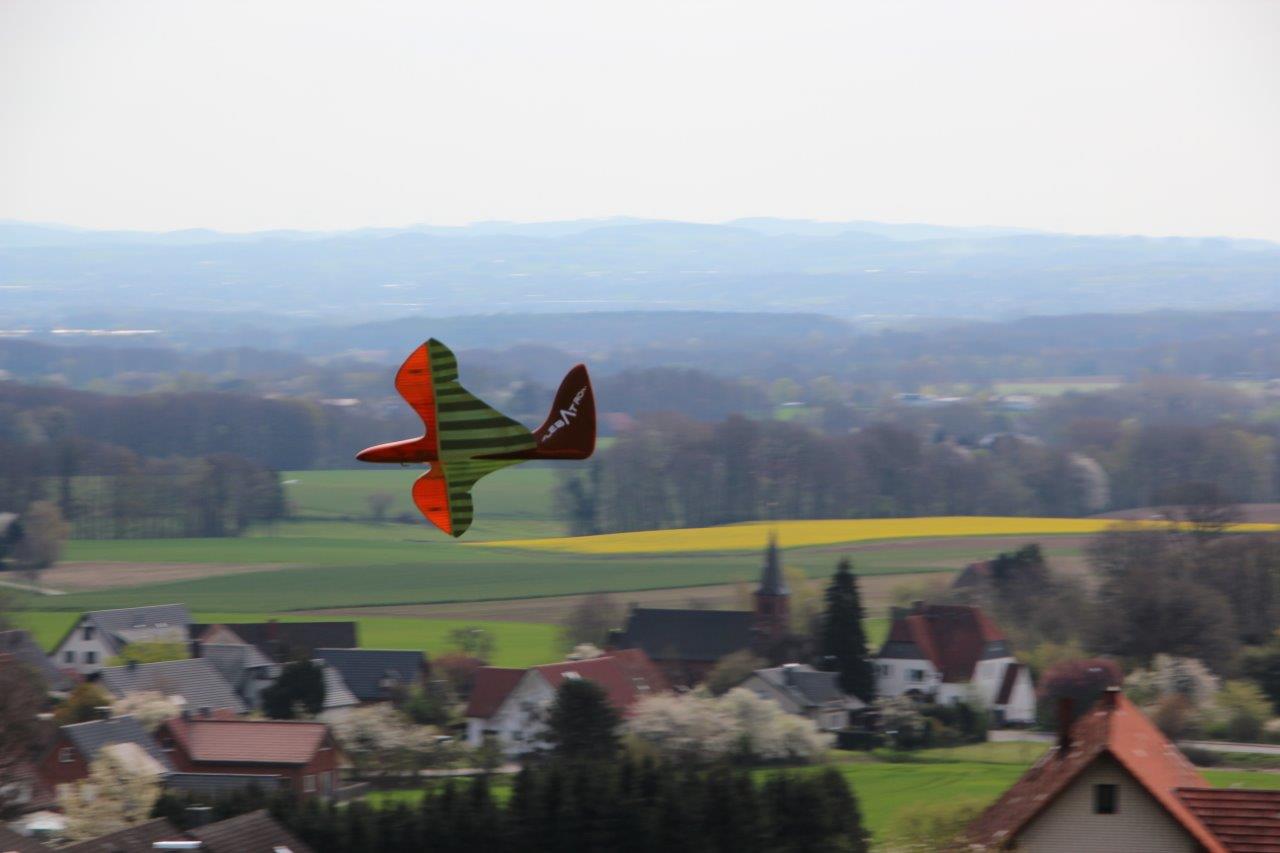Flitschengummistart, der Rumpf ist ja anders nicht zu werfen, aber man hat gleich oderntlich Speed, das HR stand beim allerersten Flug noch 2mm zu tief, aber das war am Gummi kein Problem: