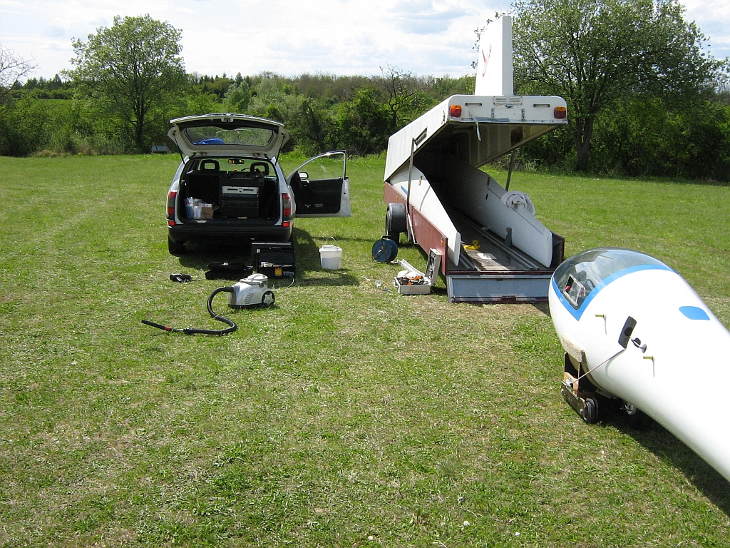 Zu erst mal wie es dazu kam. Ich war mit der Kleinen beim Hangfliegen und wollte landen. Leider hab ich etwas die Gleiteigenschaften der B4 unterschätzt und hing daraufhin in dem Busch der hinter mir Stand. Dabei hat es mir an der Wurzelrippe die Endleiste etwas zerdrückt was ich jetzt dank Christians Hilfe repariere.