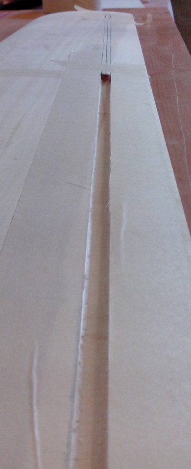 Außen werden die Flächen mit zwei CFK Rundstäben zsammengesteckt und innen werden die Flächen zusammengeharzt. Mit GFK Gewebe verstärkt. In der Beplankung an der wurzelrippe musst die kabel raus laufen lassen. Also ein Loch in die Beplankung machen. Für die WK servos muß ich selbst servoschächte anbringen.
