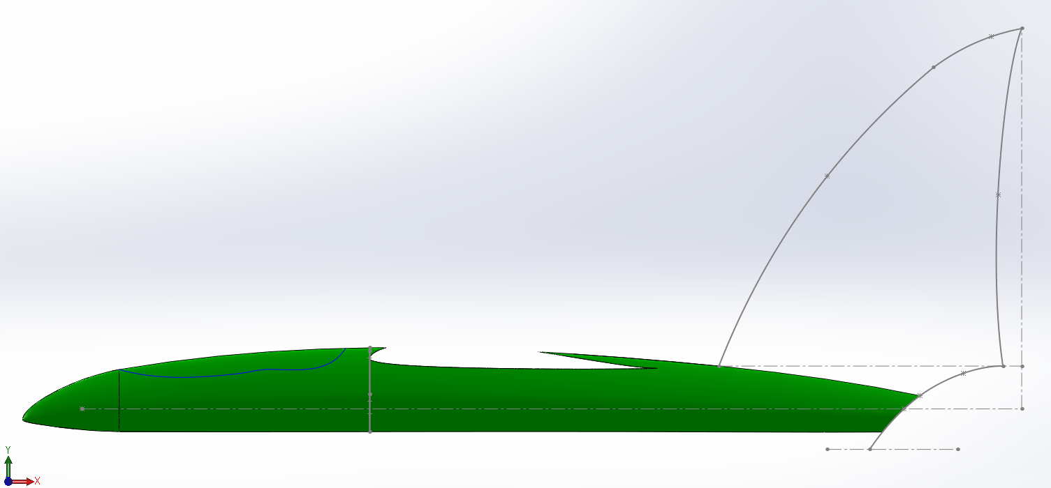 Ich finde den Rumpf jetzt langsam gelungen. Nun muss ich nur noch den benötigten Flächeninhalt für die Finne berechnen und diese dann entsprechend anpassen. Der Weg dahin kommt durch Tipps von Uwe (Vielen Dank!) so wie dem hier gezeigten Weg und dem PDF von Peter Wick.