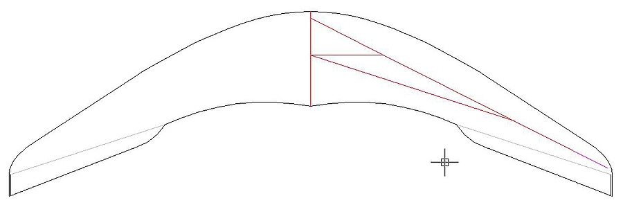 So sieht der Flügel jetzt aus: Die Rippen habe ich aus dem "Nurflügel" von Frank Ranis als dxf exportiert und in die CAD-Zeichnung mit dem geomatrisch geglätteten Flügelgrundriss hineinkopiert. Das "Nurflügel exportiert keine Splines, sondern nur Vielecke die besonders im Nasenbereich zu ungenau für Fräsrippen sind. Deshalb habe ich über alle Exportrippen im AutoCAD 2D einen Spline gelegt und die Splinerippen an die Einbauposition eines halbenn Flügelgrundriss kopiert.