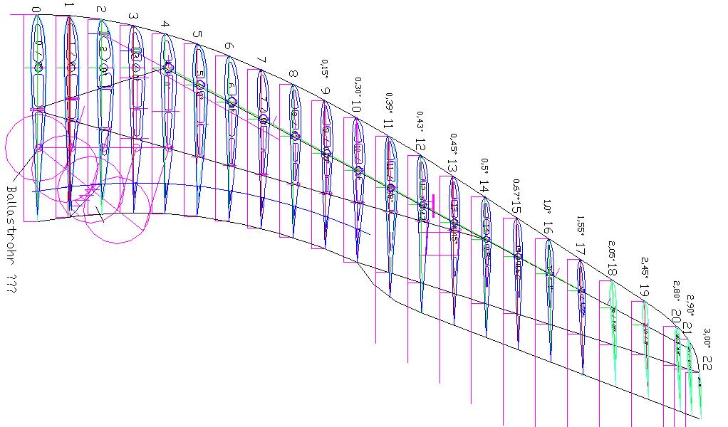 Ich habe Gestern die Zwischenprofile für die Rippenbauweise im "Nurflügel" von Frank Ranis noch eingefügt. Die aerodynamische Auslegung hab ich mit einem Rippen- = Stützstellenabstand von ca. 100 mm gemacht, die Rippenbauweise braucht aber einen Strakprofilabstand von ca. 50 mm. Diese Anpassung mach ich im alten "Nurflügel" weil es dort schneller geht. Damit hab ich auch den dxf-Profilexport aus dem alten Ranis gemacht, auch wenn ich dadurch die Splines manuell über die Vielecke der Exportdateien legen muss.