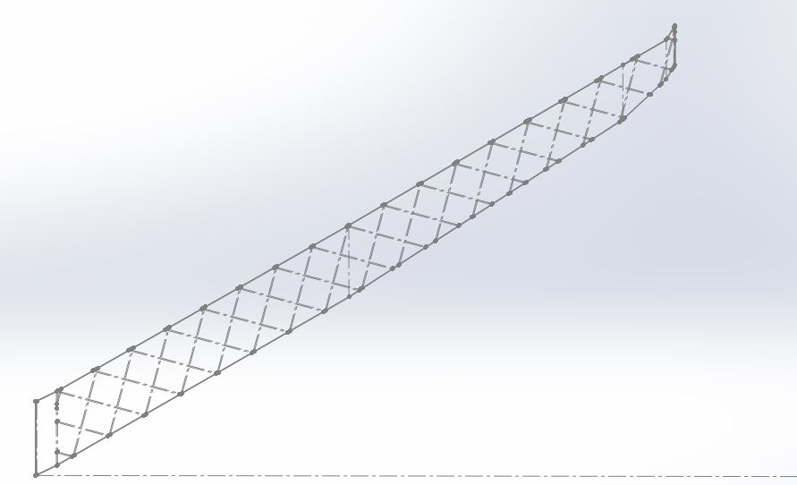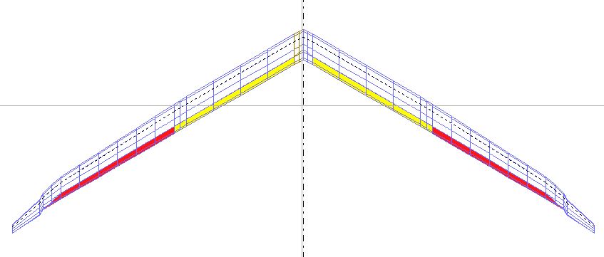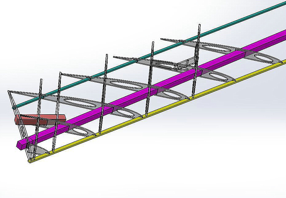 Das was mir bei deiner Konstruktion momentan nicht gefällt ist das sich immer nur 2 Rippen kreuzen, ich würde die Rippenabstände soweit minimieren das sich mindestens immer 4 Rippen gekreuzt eine geschlossene Raute ergibt und das es sowohl gegen End und Nasenleiste noch eine überschneidung gibt.