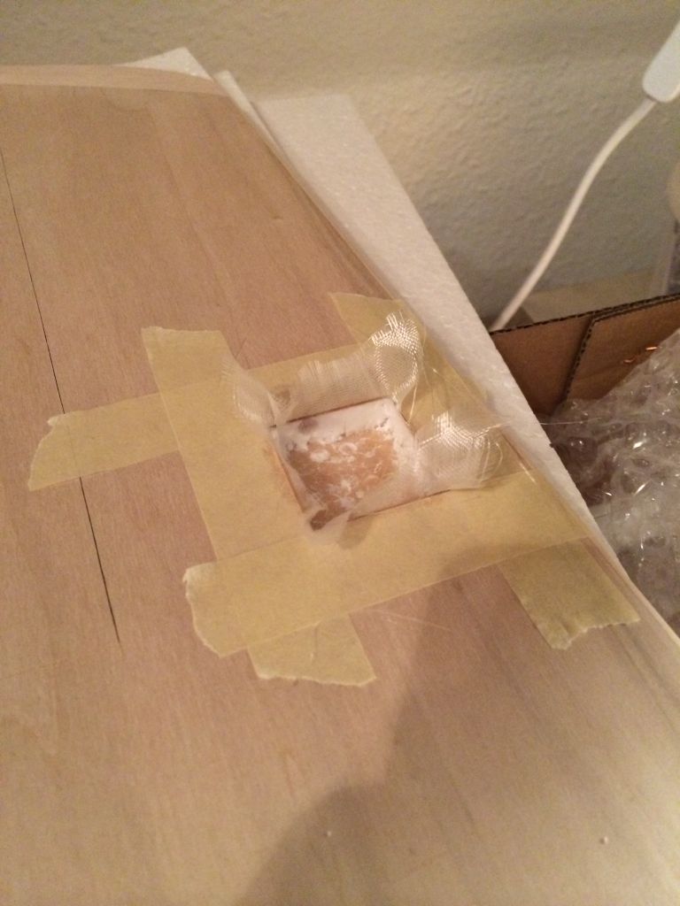 Danach wird das V-Leitwerk zunächst mit Sekundenkleber zusammengeklebt und die Dreieckleiste mit Epoxy eingeklebt. Über die Klebestelle kommt dann noch eine Lage Glasfasergewebe.