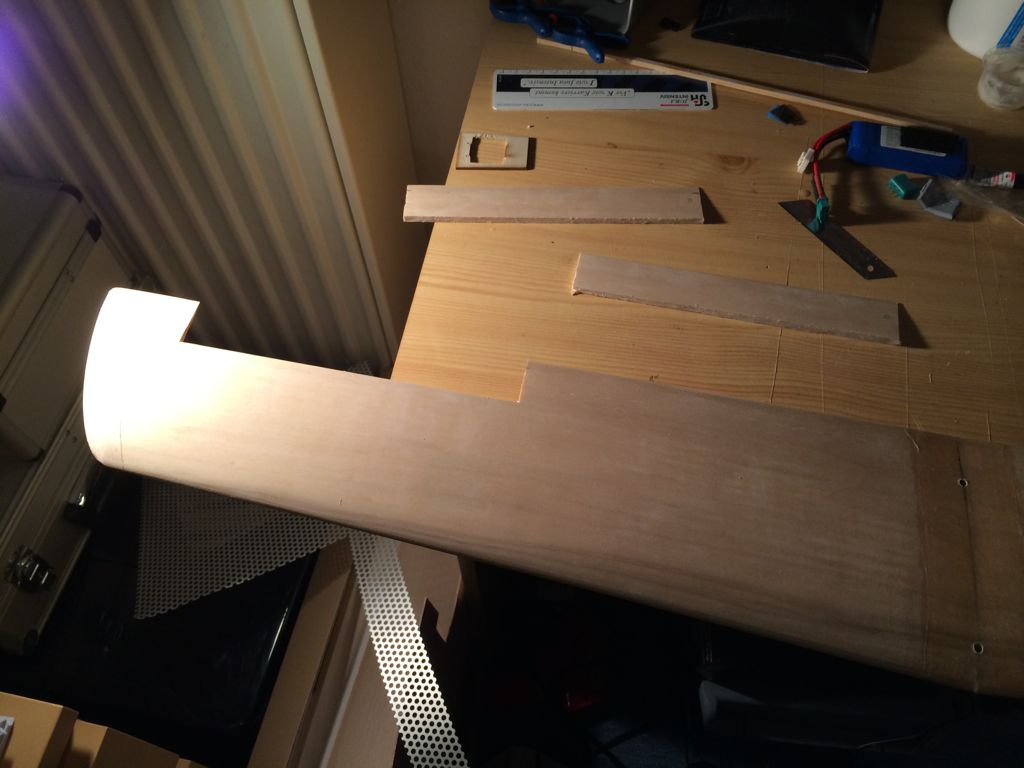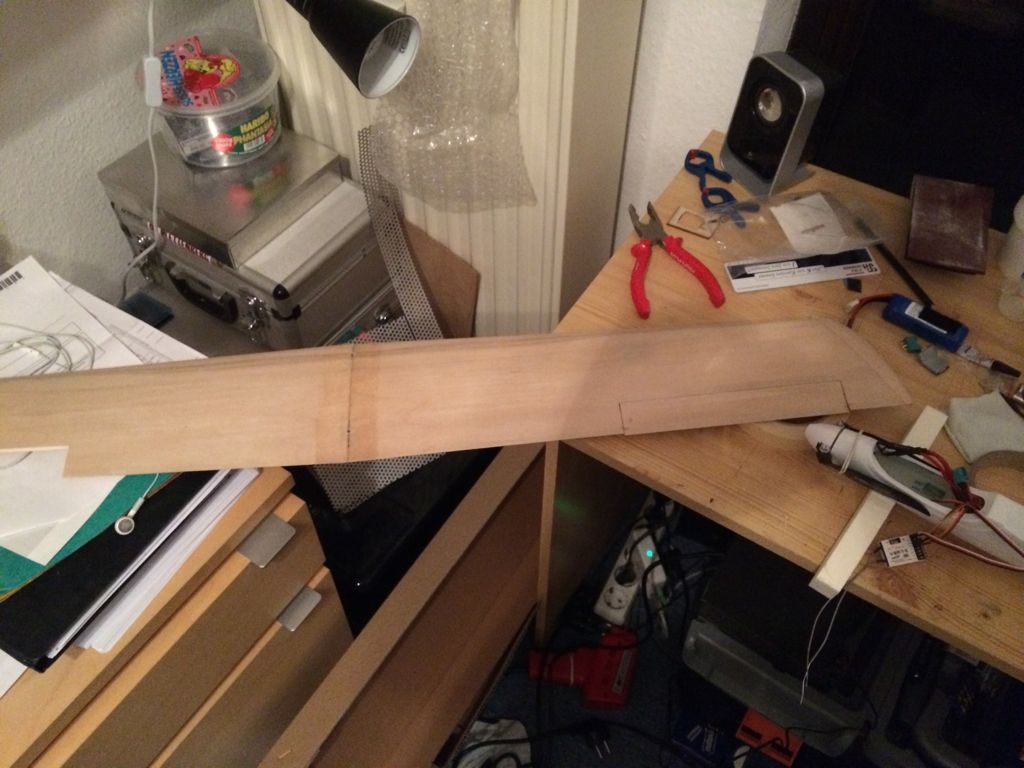 Danach habe ich die Holzklötzchen, welche als Flächenverbinder und Verstärkung für die Flächenschrauben dienen in Form geschliffen werden. Im Styrokern der Fläche werden nun noch die entsprechenden Aussparungen gemacht. Hierzu habe ich das Styropor einfach mit einem Lötkolben weggeschmolzen. Jetzt noch schnell die Servokabel in die Kanäle einziehen und schon können die Flächen verklebt werden.