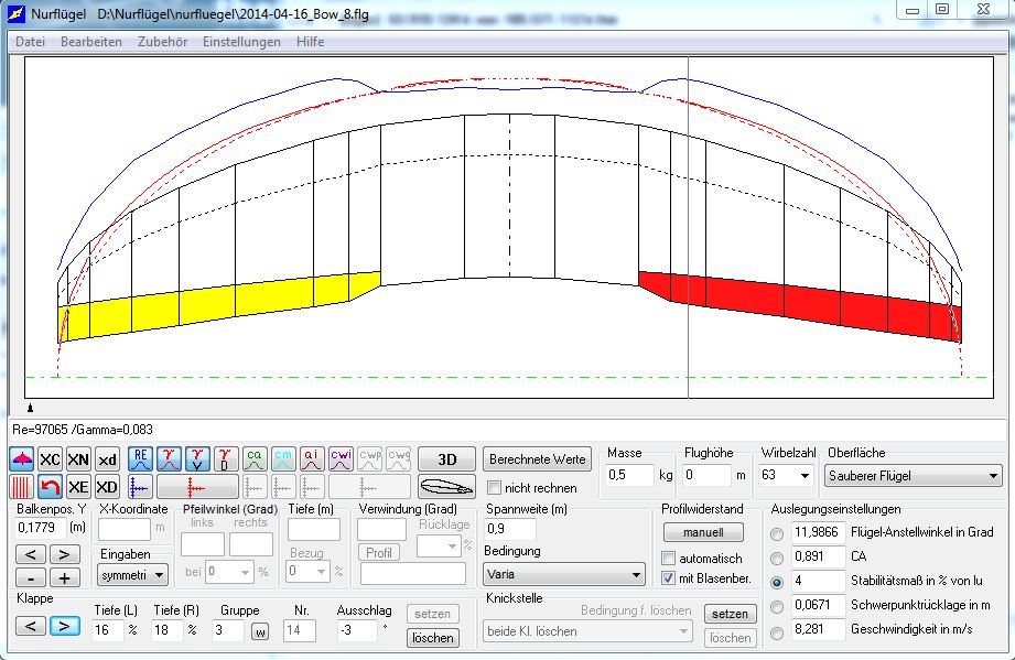 Der Auslegungs-cA für die Profilmodifikationen ist cA 0,2 bei Klappen im Strak und 400 Gramm Fluggewicht = 33 g/dm² Flächenbelastung.