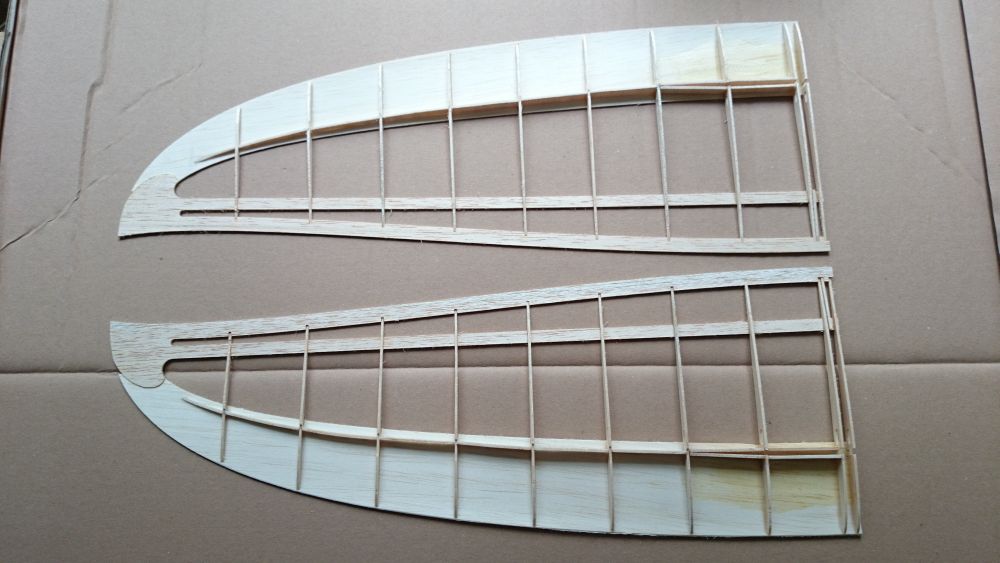 Sooo, wir haben die Flächen angefangen und haben echt damit zu kämpfen diesen Hauch von Nichts zu einer Rippenfläche zu verarbeiten. Die äußeren Rippen haben an den Aussparungen nur noch 0,3mm (!) Materialstärke und das bei richtig leichtem und weichem Balsa. Genau an der dünnsten Stelle ist auch noch ein Steg vom Fräsen den man abschleifen muss. Ebenso das Höhenpaddel, siehe Bild, kaum Material vorhanden und dann noch bei der Faserrichtung. Weil es wirklich alles so wabbelig und filigran ist überlegen wir echt, ob wir überhaupt noch Querpaddel einbauen.