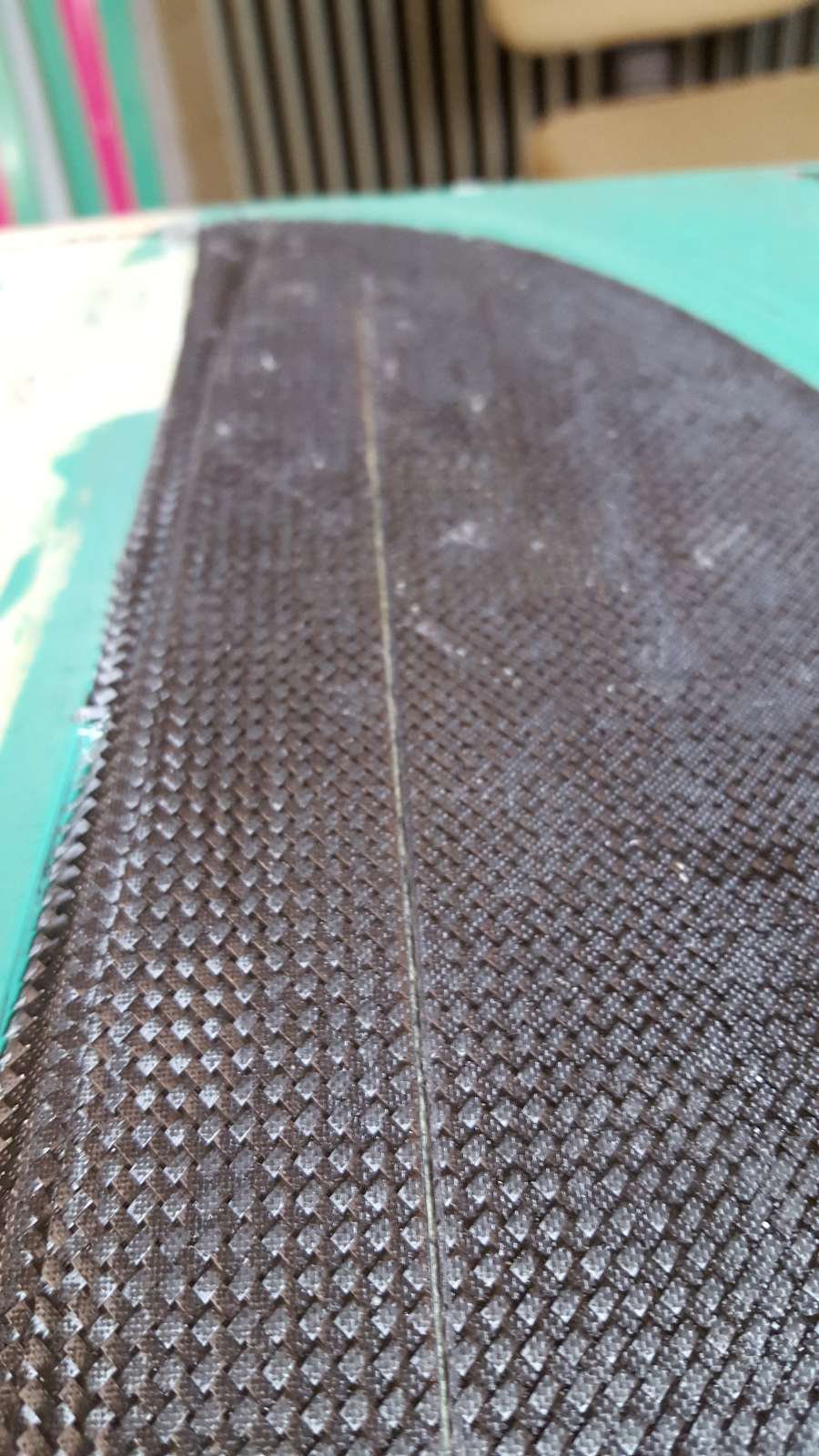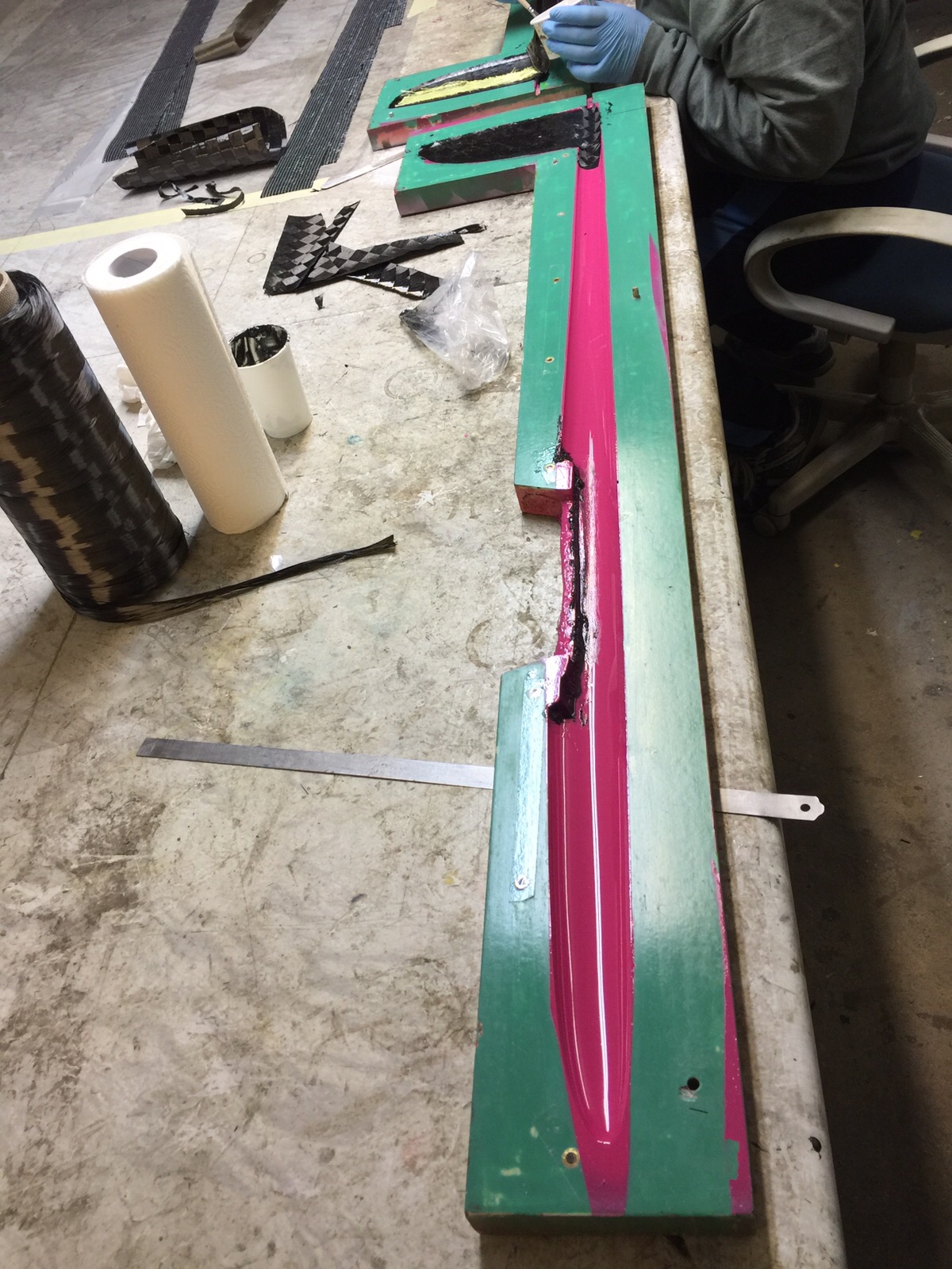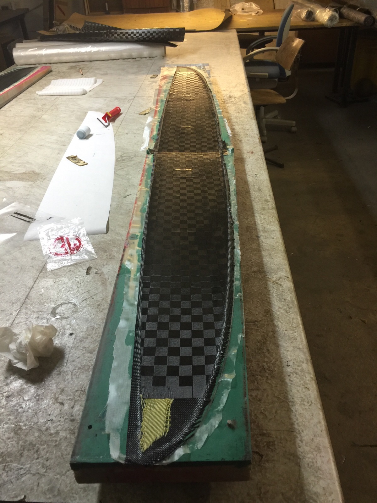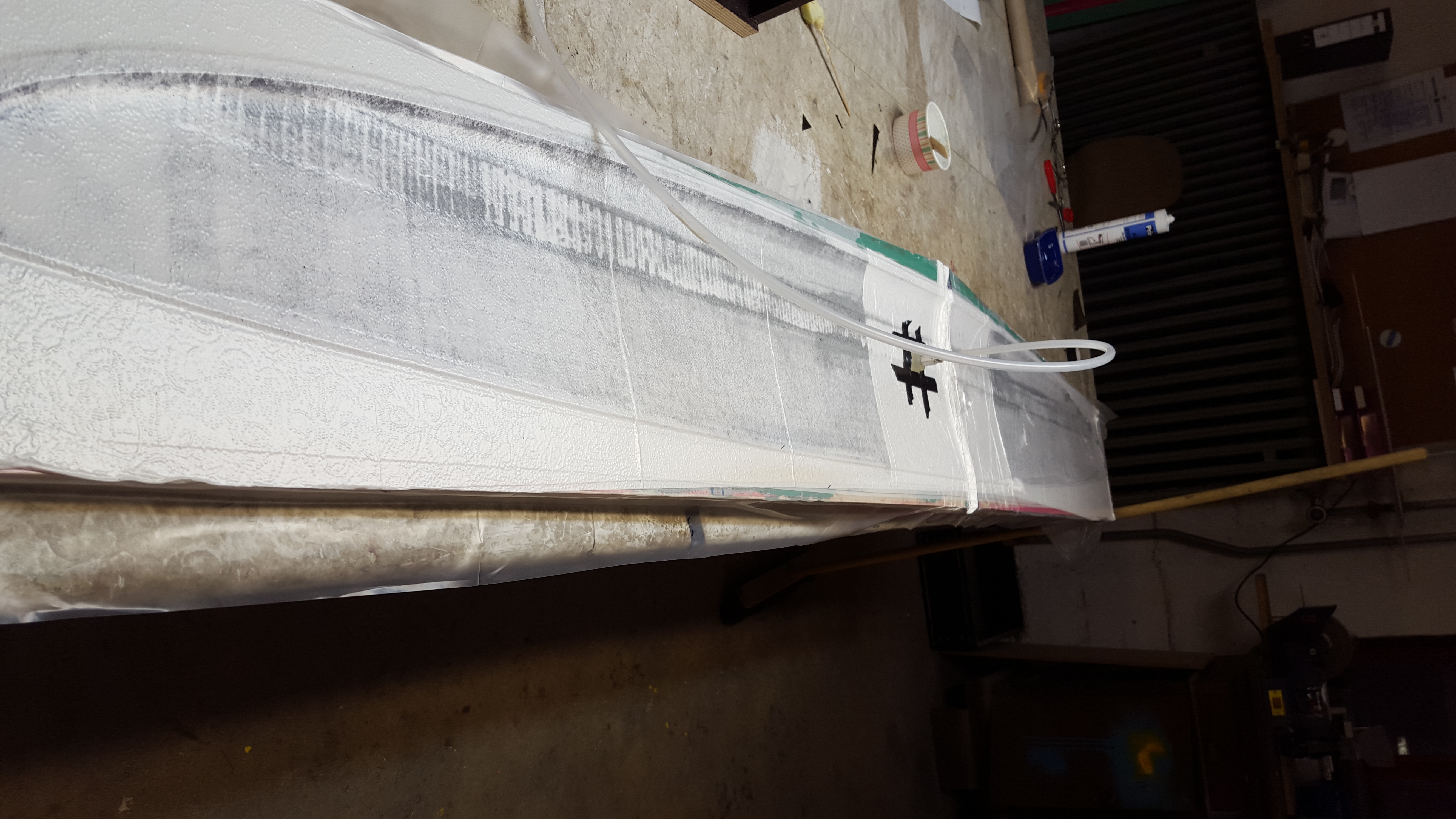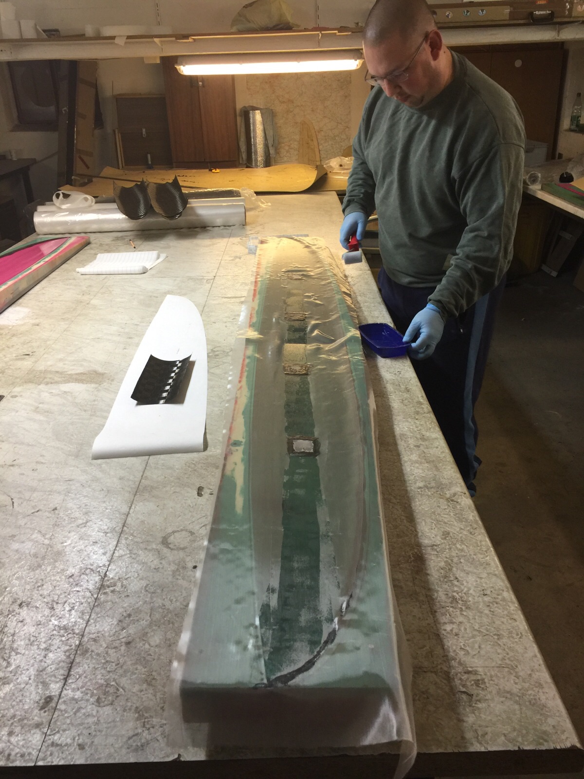 Während die Stege für den Rumpf und die Glasstreifen angelieren durften haben wir die Wartezeit genutzt um die Flächenstege fertig zumachen, wie oben beschrieben. Als der Glasstreifen dann trocken genug war haben wir die Kanten besäumt. Anschließen alles nochmal schön mit frischem Harz eingepinselt und Mumpe angerührt. Diesmal Harz, Baumwollflocken und Kohlepulver. Damit wurden dann die Raupen auf sämtliche Kanten gezogen. Ich benutze dafür sehr gerne einen Spritzbeutel der Marke Frischhaltebeutel.