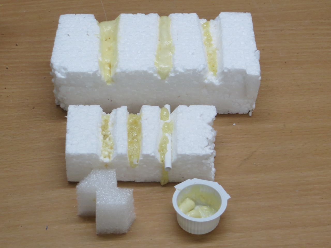 Verklebung mit festem Schaumstoff - hält nicht :-( Angerührt in einem ausgespülten Becherchen für Portionsmilch