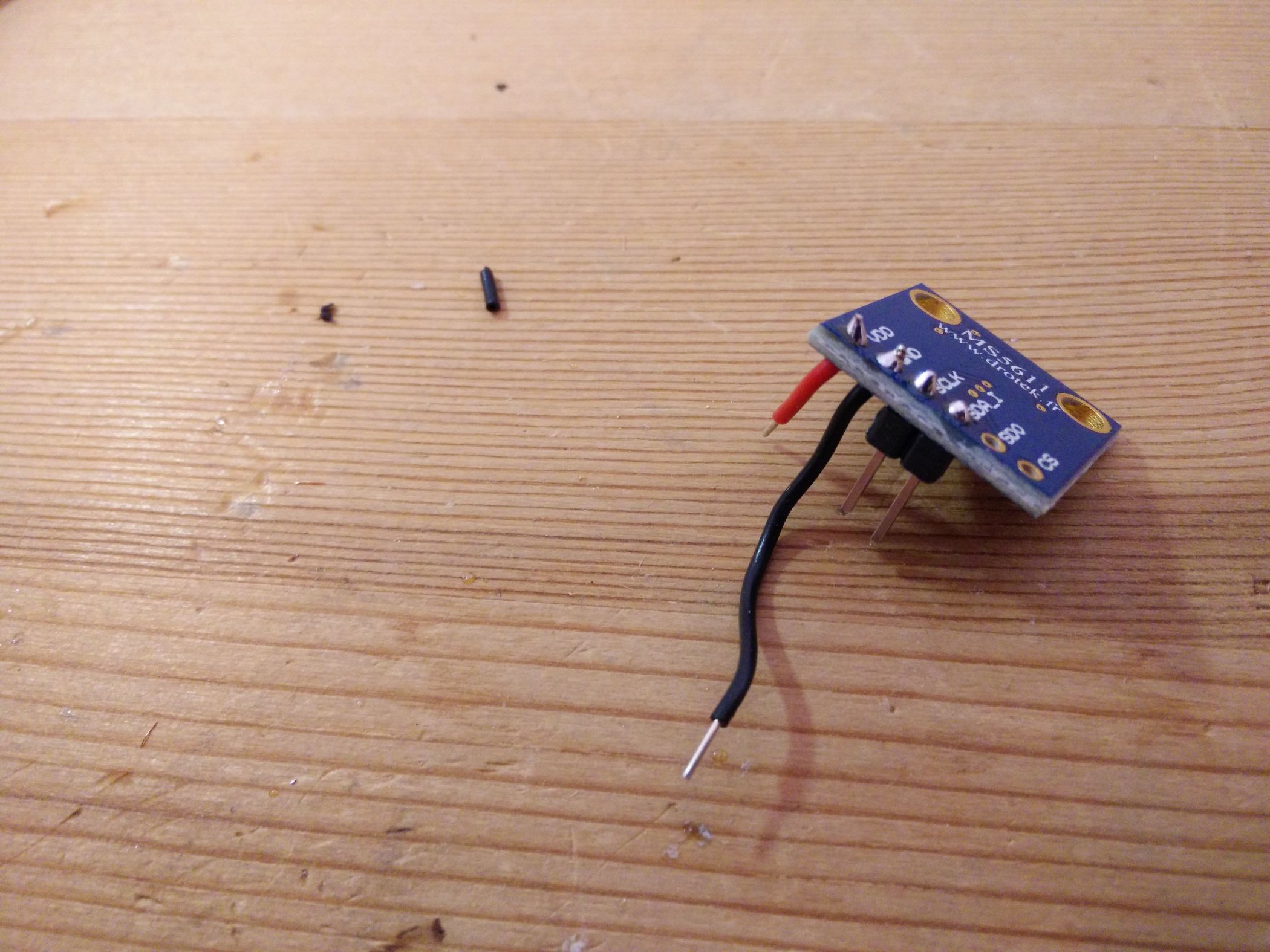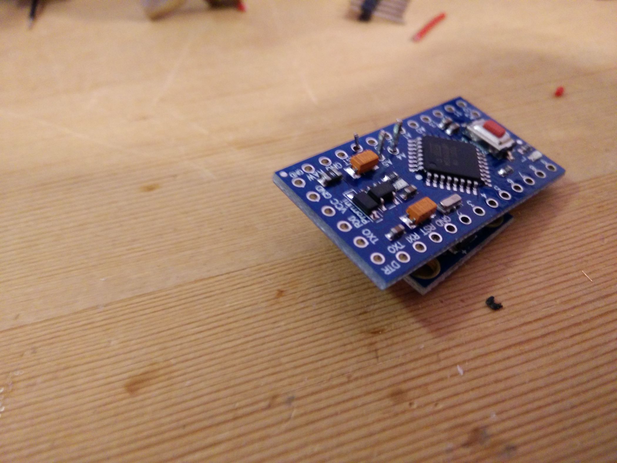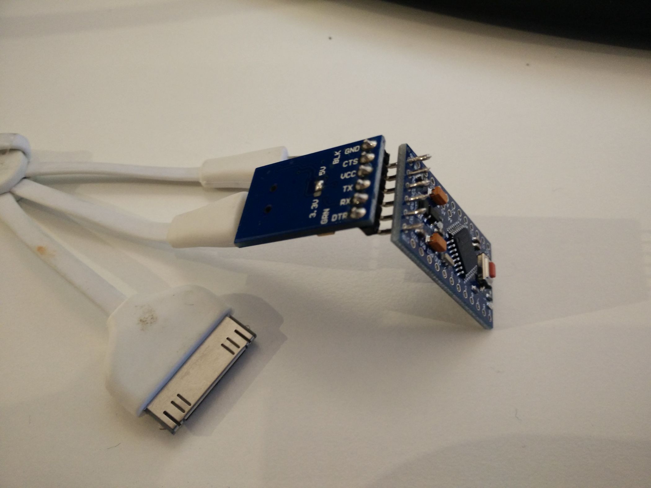 Nämlich so Und es kommt ein schwarzes Drähtchen in GND, ein rotes in VDD: Dann in SCLK und SDA eine 2er Stiftsockelleiste und Festbraten. Jetzt noch das GND-Kabel etwas verlegen … Und so lässt sich das ganze aufstecken. VDD auf dem MS5611-Board kommt in VCC auf dem Arduino-Board. Aber wir löten das noch nicht so fest … erst einmal wird Programmiert. Wir schauen also am FTDI welches Beinchen wo hin gehört — GND zu GND passt (steht ganz am Rand), CTS zu GND, VCC zu VCC, TX zu RX, RX zu TX, und DTR auf DTR … Damit ich nicht löten muss klemme ich das einfach so fest … … und sorge für etwas Vorspannung der Kontakte so dass diese auch wirklich anliegen. Jetzt wird noch schnell ein Servokabel gecrimpt und die enden Verzinnt … Und nach Anleitung aufgesteckt. Von der Oberseite sieht man es besser … … hier: Gelb kommt auf 4, Rot auf RAW, Schwarz auf GND direkt neben RAW. Jetzt dürfen wir also das MS5611-Board wieder aufstecken (Hinweis: Ich habe das Servokabel wieder abgemacht damit man den Rest besser sieht…) Und uns noch einmal versichern: SDA auf A4, SCLK auf A5 — VDD auf VCC, GND … noch nicht… … festbraten — und der GND-Draht steht jetzt dank vorbiegen auch schon passgenau unter dem GND Löchlein am Reset-Taster bereit. Also einmal umbiegen, rein damit, und festlöten. Tjaaa … und das war’s. Jetzt noch der Flash-Vorgang etwas genauer: