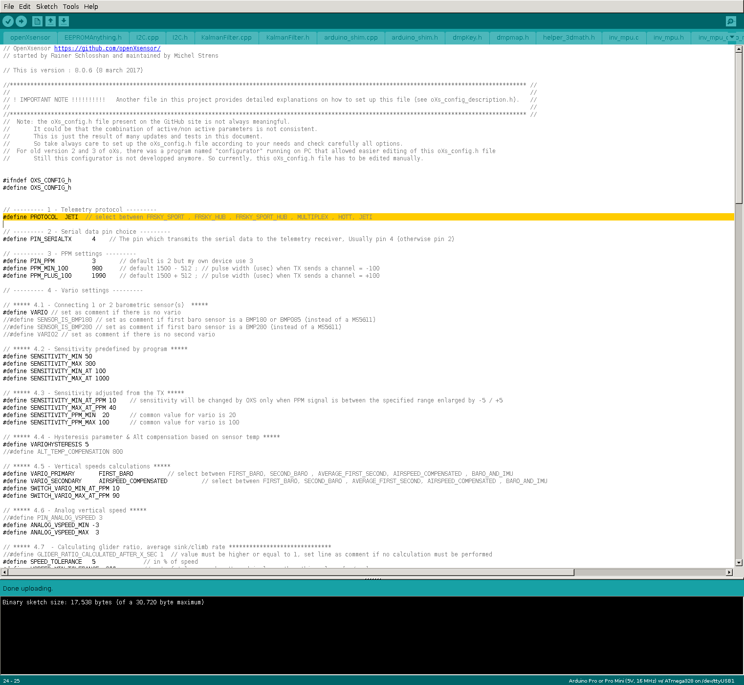 Ich habe erst die von Dario verlinkte Datei aufgespielt und obwohl ich die config_h angepasst hatte, wurde der Sensor nicht erkannt. Ich habe daraufhin dann die neueste OpenXsensor Version von github heruntergeladen und diese auf mein Vario gespielt. Jetzt wurde zumindest der Sensor erkannt, aber irgendwie piept mein Vario nur fröhlich und ohne Logik vor sich hin, aber zeigt mir nicht die richtigen Werte an. Auch ein Steigen bzw. Sinken wird nicht richtig erkannt und die Höhe ist auch eine Falsche.