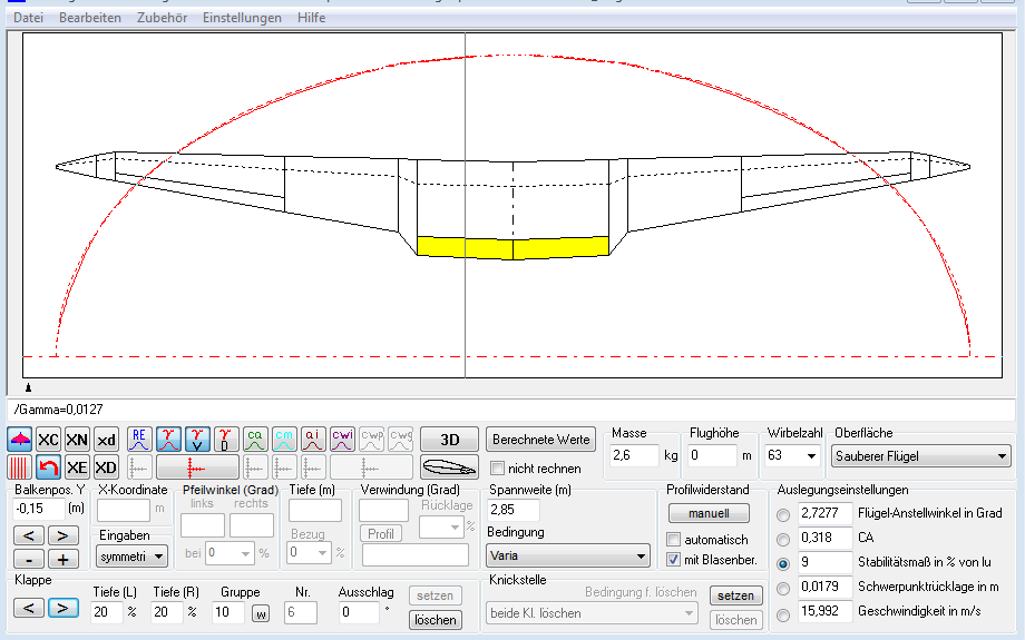 Flächengeometrie gemäß Plan, innen im Bereich des Höhenruders JWL065 -> ab Höhenruder EMX07 mit 1,3 Grad Verwindung. Stadilitätsmaß 9%. Von de Auftriebsverteilung her denke ich das die Kiste Fliegen könnte. Unsicher bin ich mir noch mit den relativ geringen Re-Zahlen am Außenflügel und dem EMX07, außerdem würde ich am Ende des Höhenruders den Sprung in der Flächendicke gerne egalisieren da dieser nur sehr aufwendig zu bauen ist. Von der Tendenz her sollte der Flieger eher Thermik/Allround ausgelegt sein.