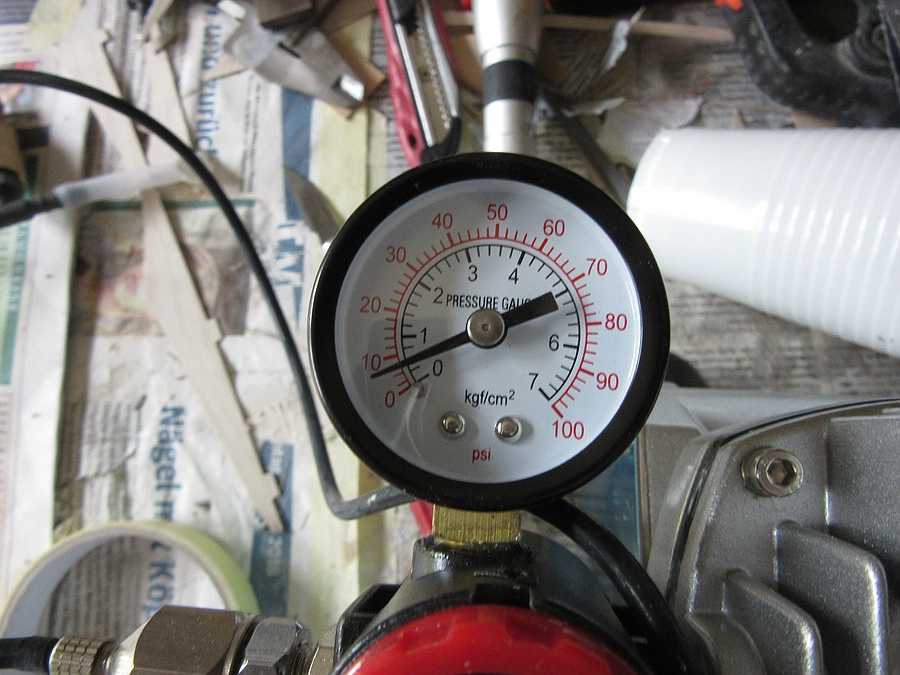 Damit sich der Anpressschlauch mit dem Gewebe in den Rumpf schieben lässt kam noch ein Rohr rein, in das ich den Druckschlauch für die Luftzufuhr eingeschoben habe. Als Pumpe habe ich einen Airbrush-Kompressor verwendet, der dabei zwar recht heiß wurde, aber zum Glück durchgehalten hat.