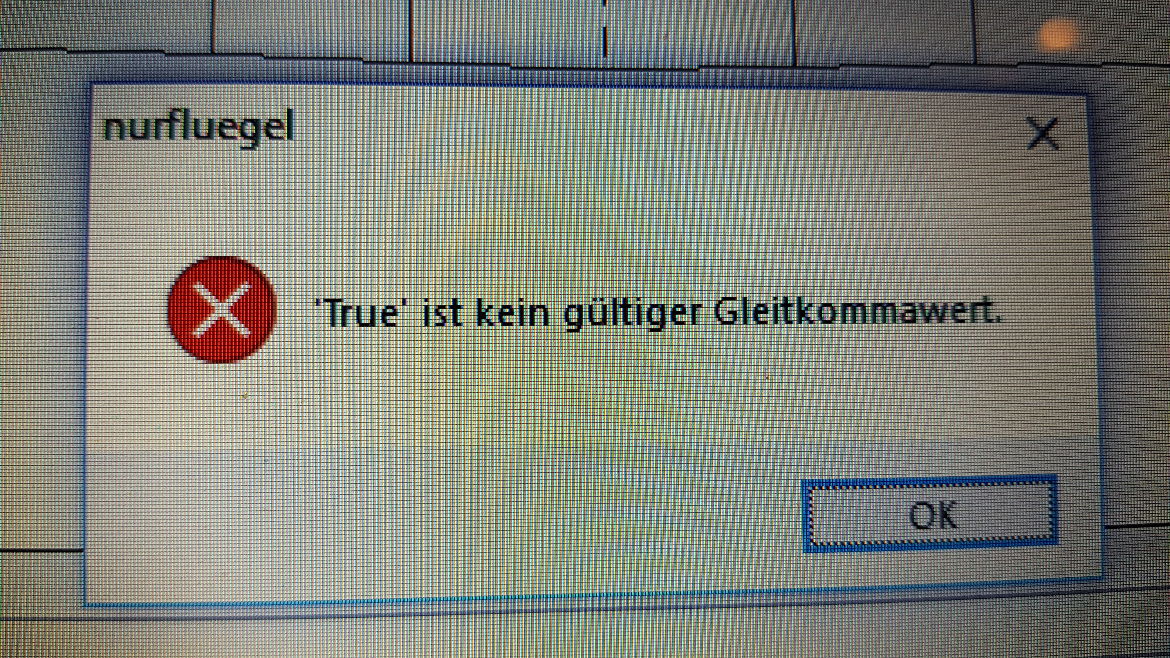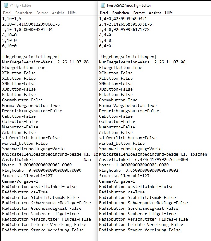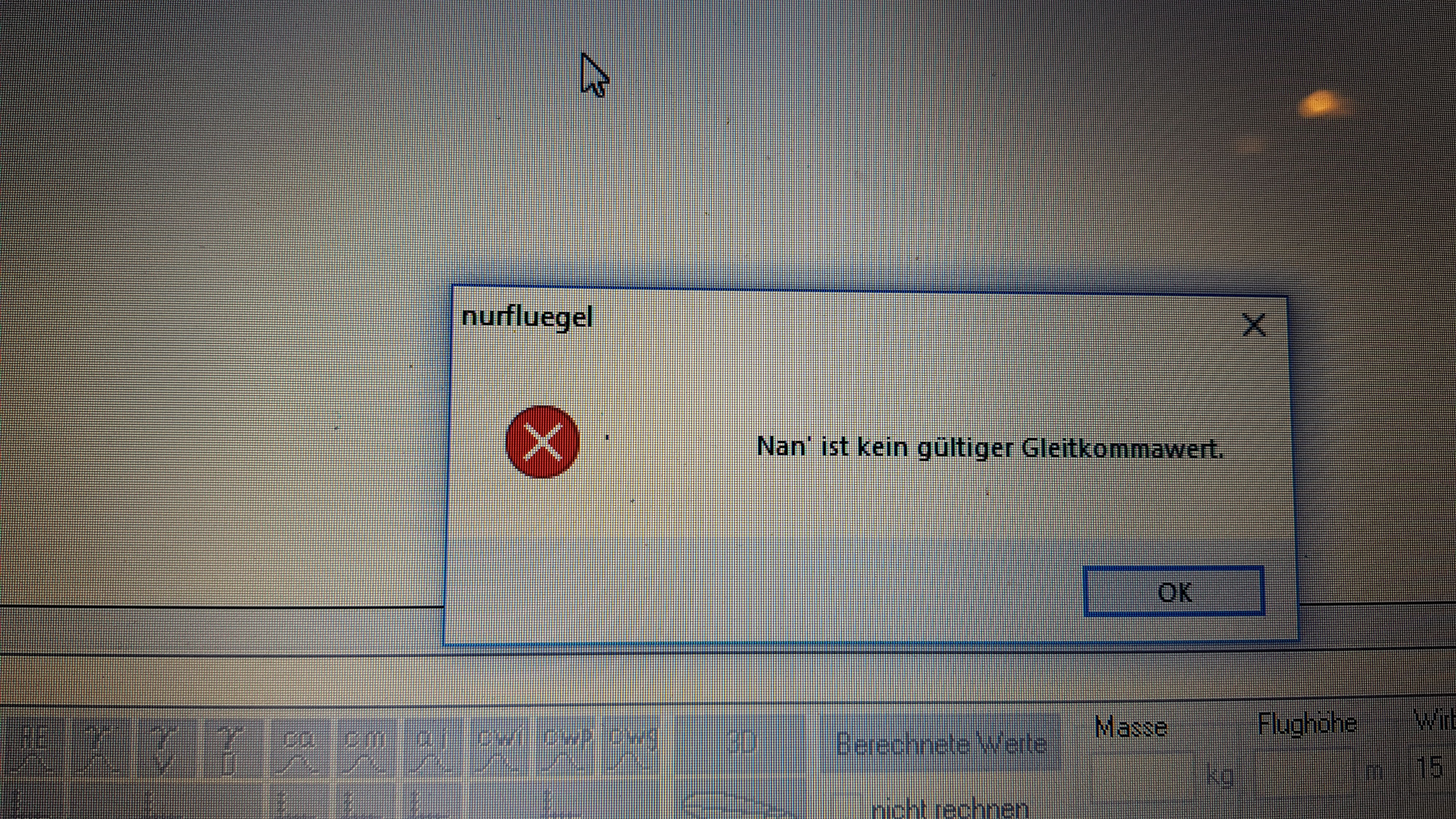 Beim Speichern führt dann irgendein Wert im Anstellwinkel-Feld zu "Nan" und somit einer nichtmehr zu öffnenden flg. Im Editor aus "Nan" eine 1 gemacht und gespeichert lässt sich die Datei zwar wieder öffnen, aber der Mist mit der undefinierbaren Zahl bleibt, ergibt also beim Schließen den selben Fehler usw usf.