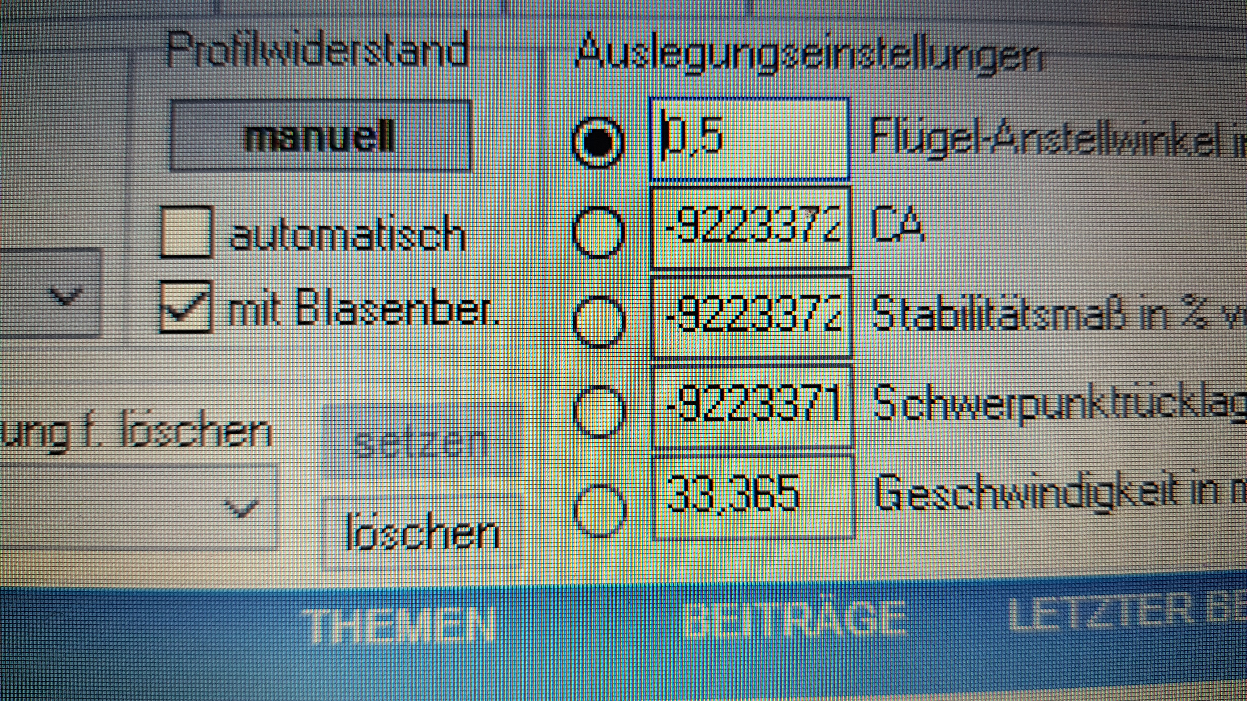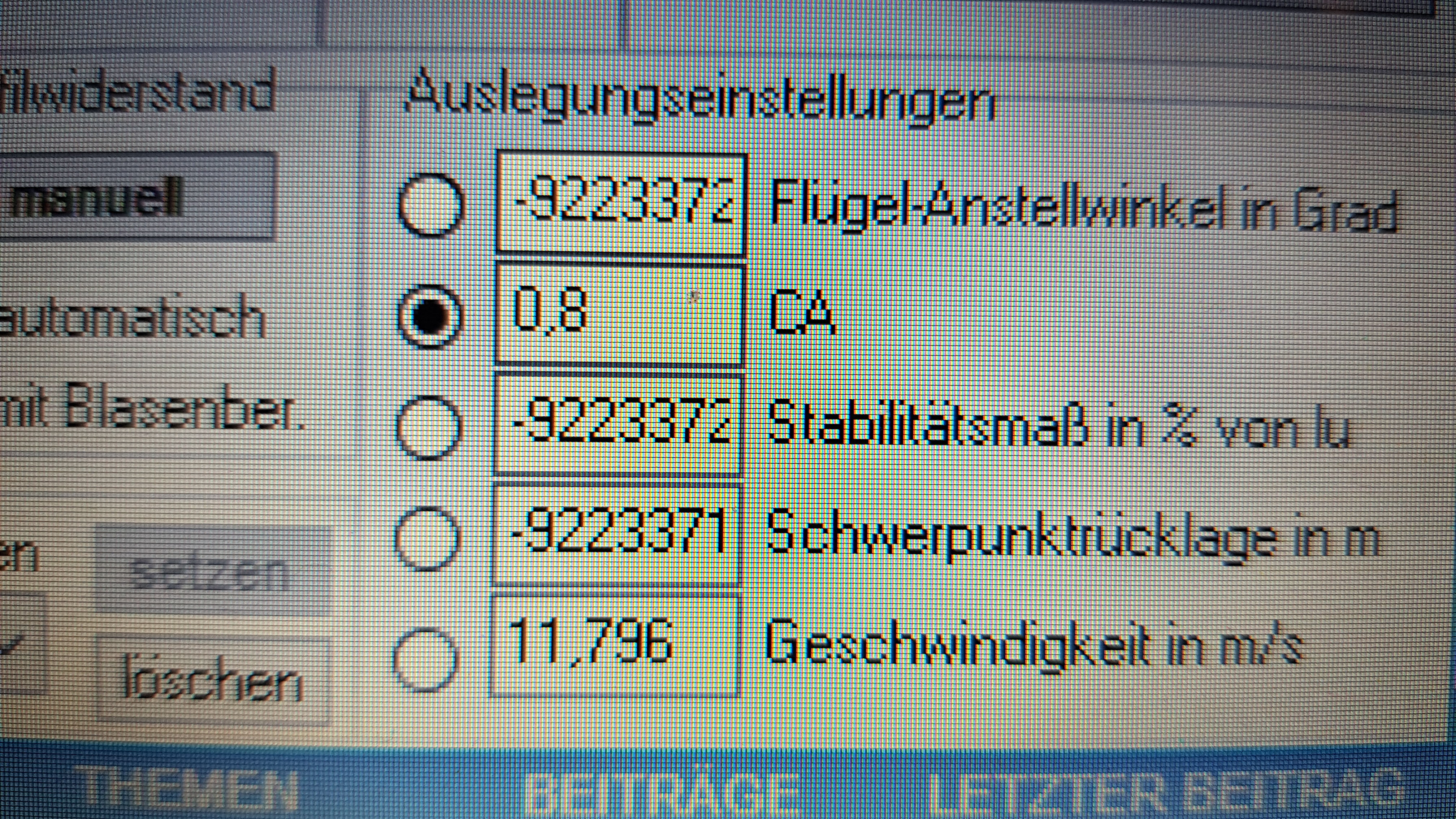 Sobald ich ein paar Trapeze eingegeben habe oder eine alte flg abändere, zerhaut es mir die Auslegungseinstellungen. Es steht da also zB CA 0,8, dann kommt spätestens nach dem 3. Trapez obendran ein Anstellwinkel von -9223372...... genau wie das Stabilitätsmaß und die Schwerpunktrücklage mit den selben Zahlen. Ändere ich zB den Anstellwinkel auf 5°, steht im CA-Feld die -9223372...