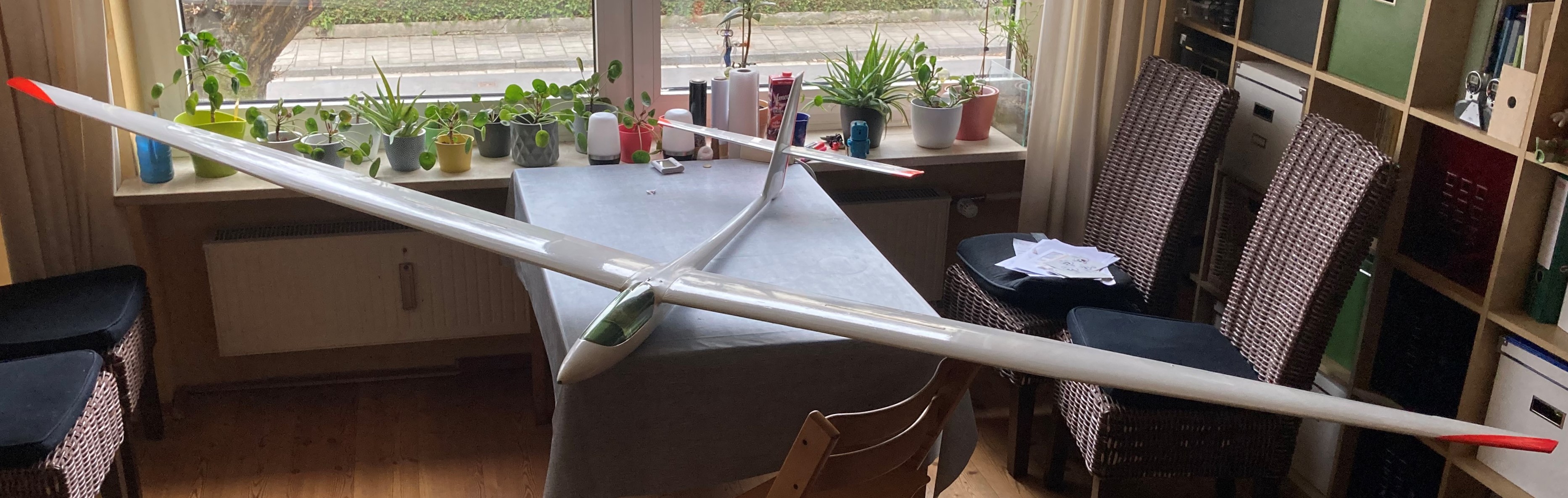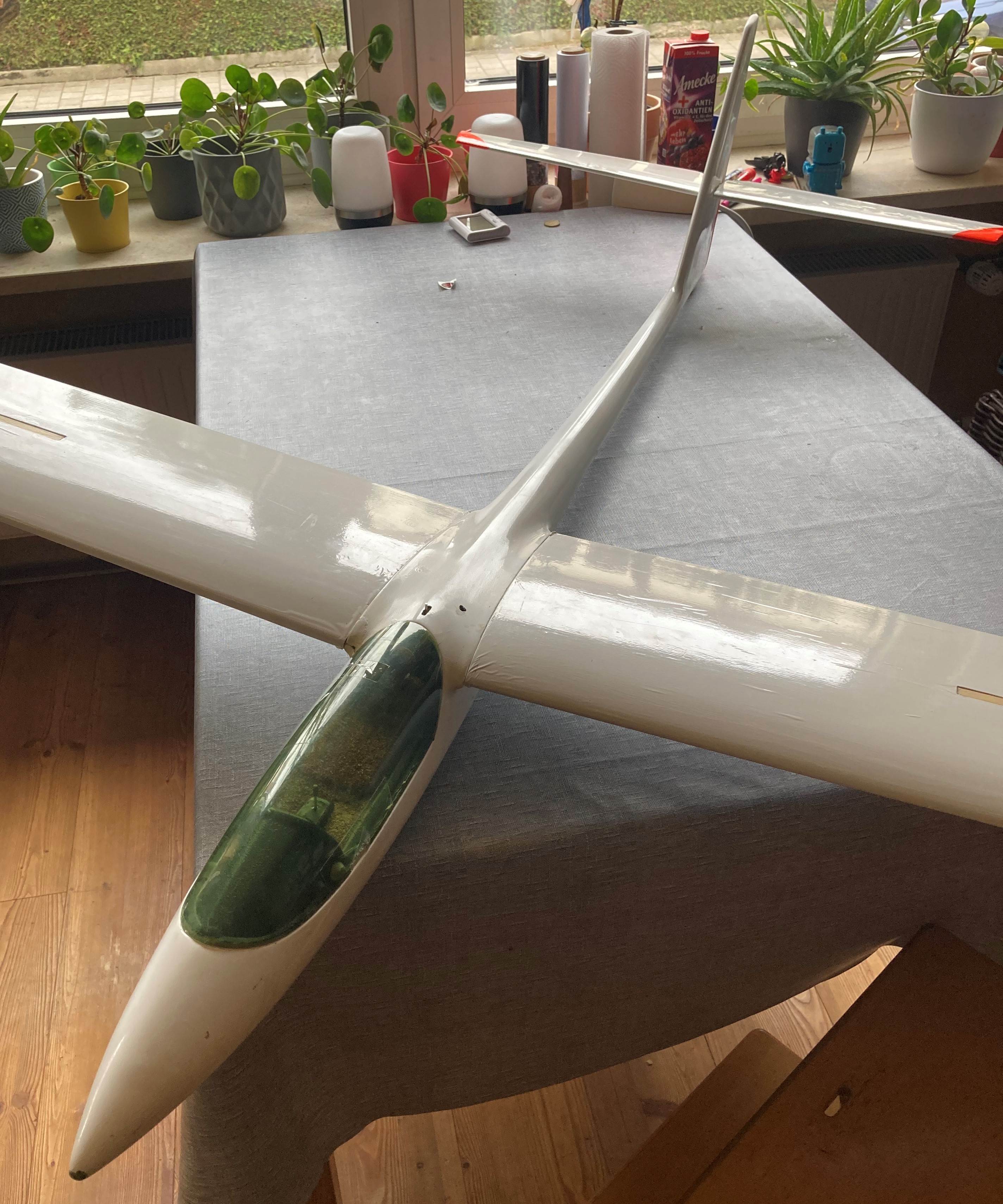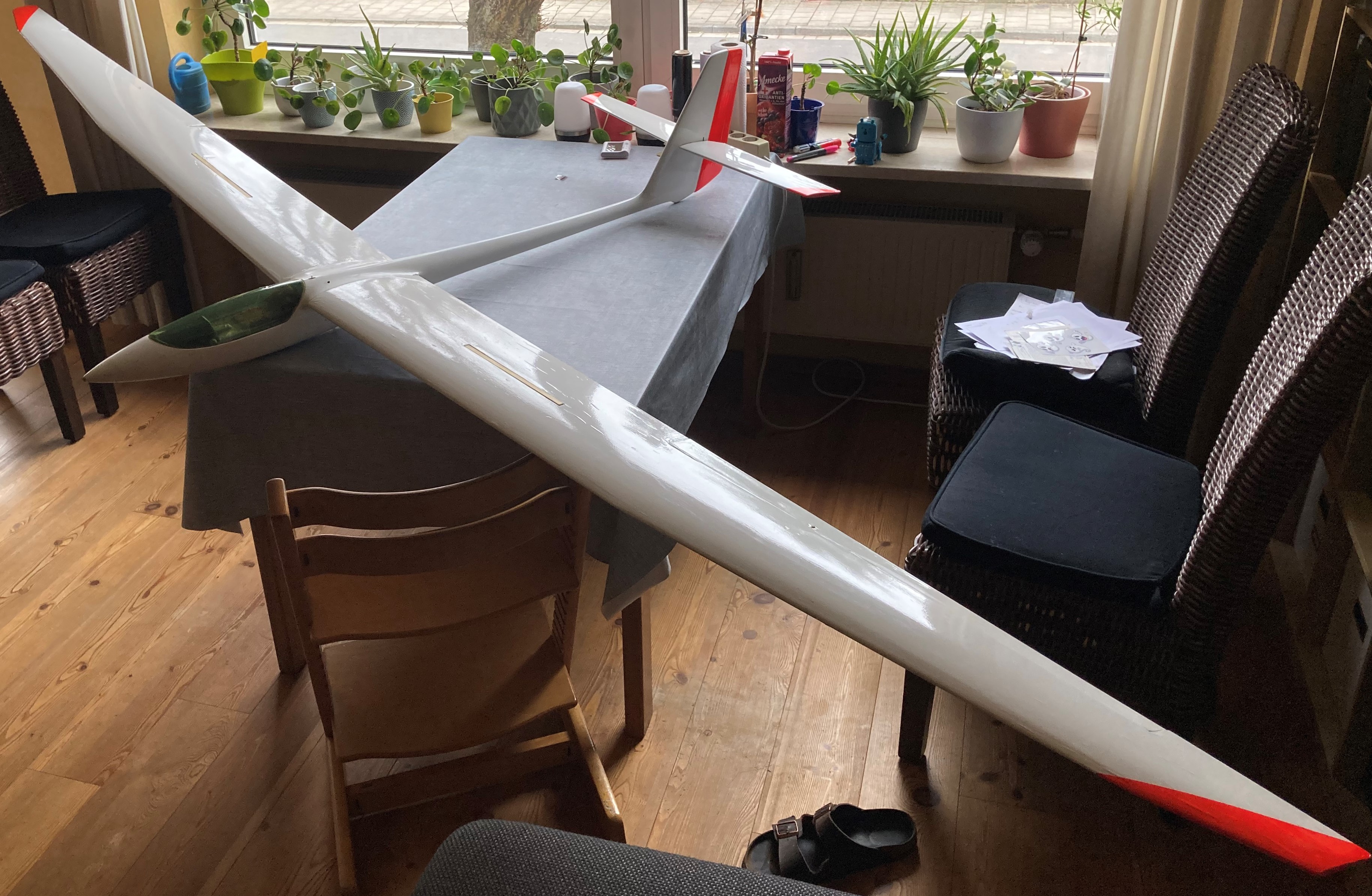 Gerne! Die Ohren sind dran, das sieht man an der Flächengeometrie mit der Zuspitzung am Aussenflügel. Für die kurze Version waren nur Randbogen zum Aufstecken vorgesehen. Wie vorher schon erwähnt, hatte der Rumpf eine fragwürdige Qualität - meiner jedenfalls. Keine Naht sichtbar, dafür eine brüchige Gelcoat-Oberfläche, die auch im hinteren Rumpfbereich dick (=schwer) war und viel Ballast in der Nase erforderte.