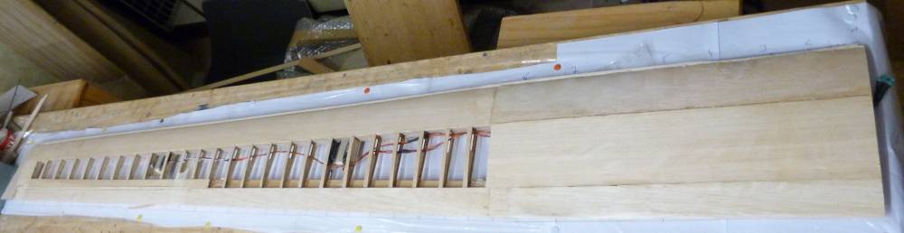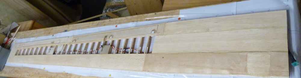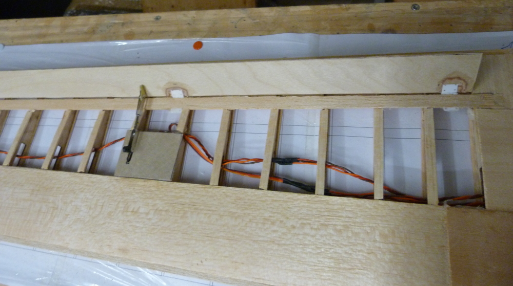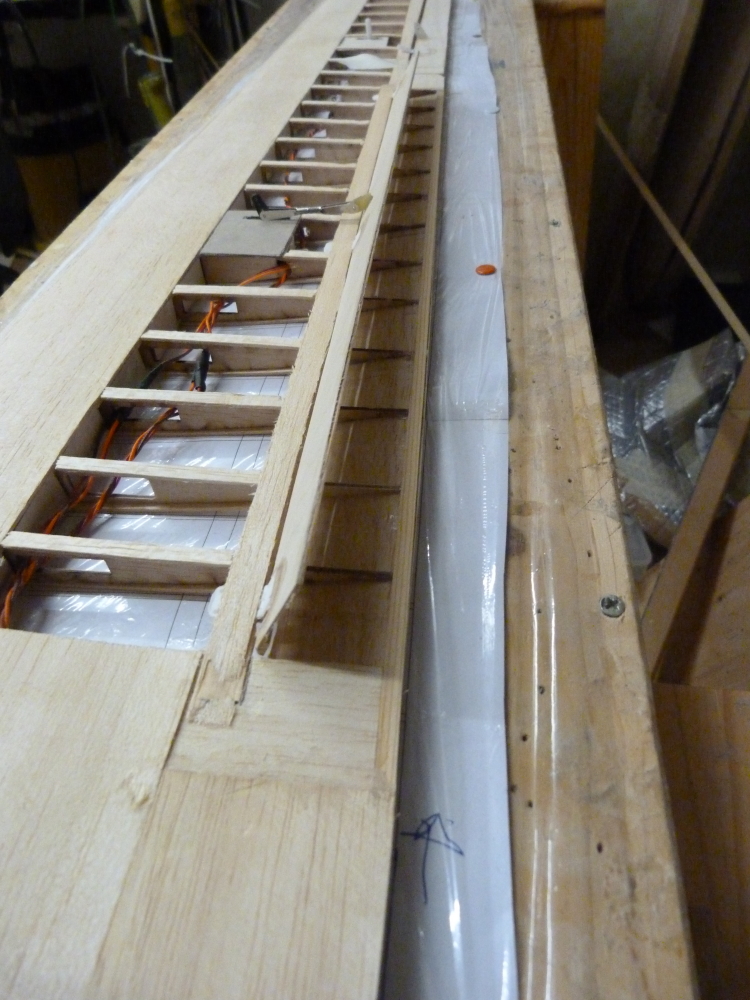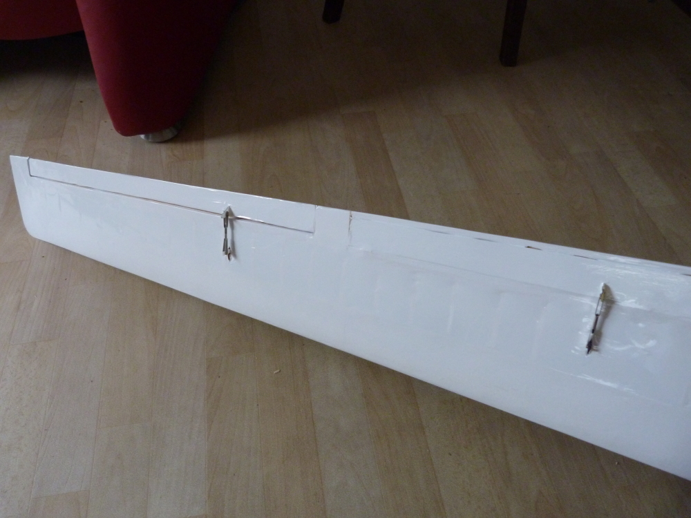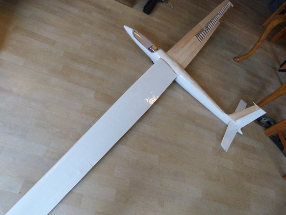 Eine Fläche ist so weit fertig und am Flugzeugrumpf habe ich einen Test mit der Beschichtung mit Folie versucht.