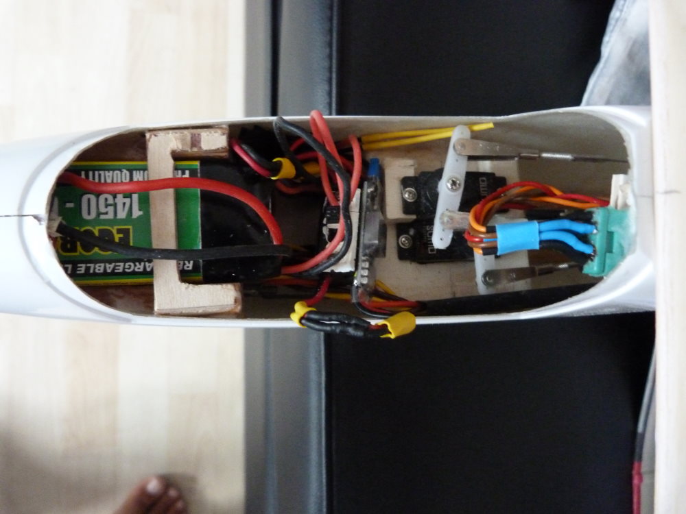 So richtig was zum Bauen gibt es nicht – in den Rumpf müssen 3 Servos (mit Schleppkupplung). Seitenruder Anlegung habe ich mit Seilzügen gemacht das Höhenruder mit Bowdenzug. Stromversorgung und Empfänger – das wars.
