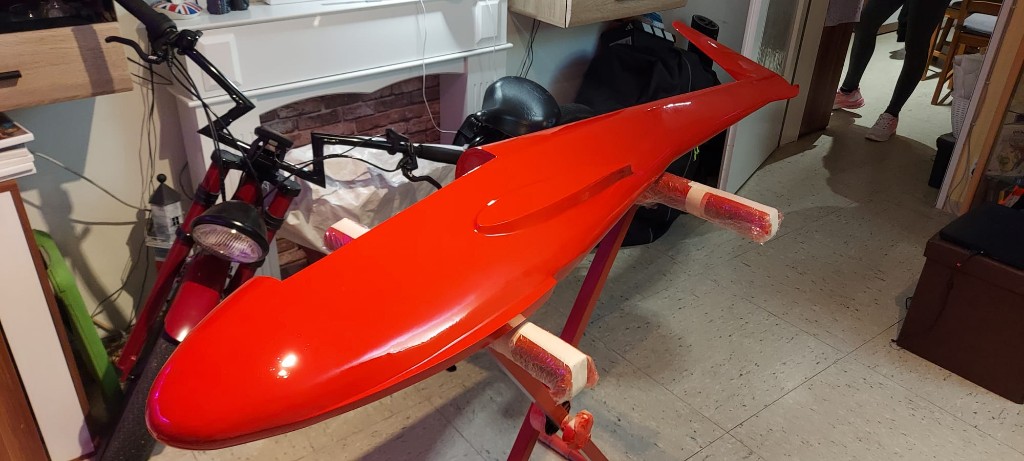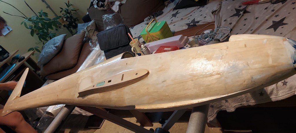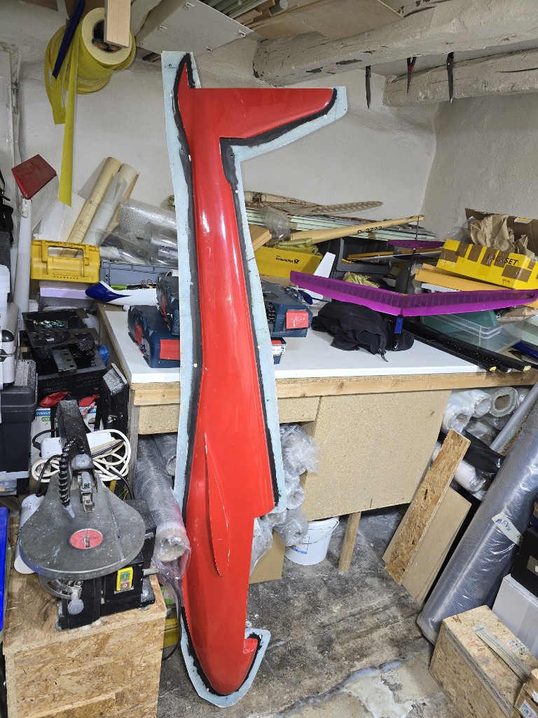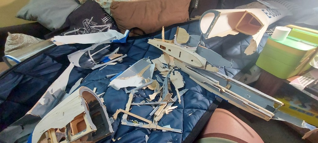 Tobi hatte beim letzten Urlaub hier leider eine kleine Gravitationsirritation mit seiner heiß geliebten Mg 19. Ersatzteile waren/sind keine mehr verfügbar, also musste Plan B her... Auch wenn die Brocken erstmal nicht danach aussahen, als wäre eine Wiederbelebung möglich, der Schmerz und das Ärgernis waren so groß, dass er mit Hilfe seiner Frau, hektoliterweise Sekundenkleber, Tonnen an Spachtel und viel Geduld daraus wirklich wieder einen, als Urmodell, absolut brauchbaren Rumpf gezaubert hat.