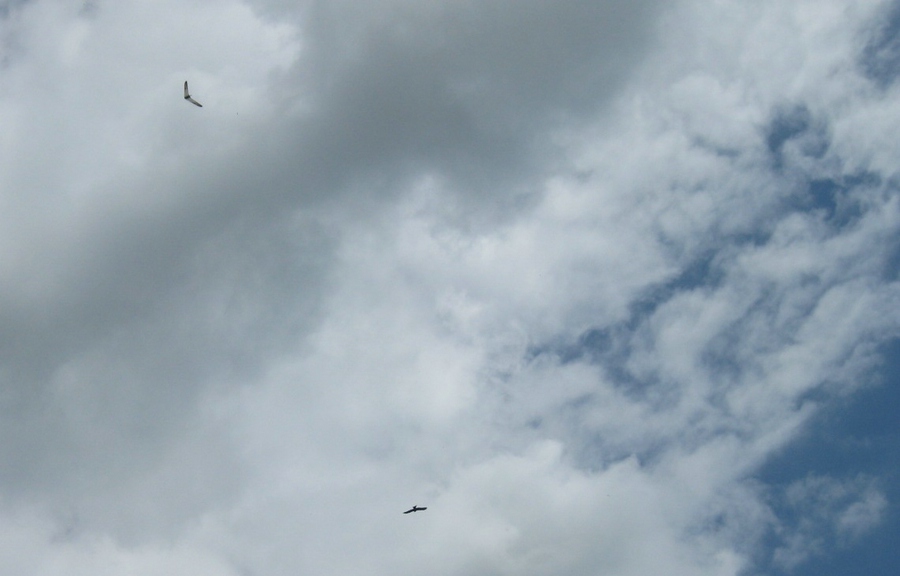 Jürgen hatte leider einen Kabelwackler, so dass nur wenige Flitschenstarts möglich waren bevor er den Flugbetrieb einstellen mußte, aber ich hatte mehr als 2 Stunden reine Flugzeit bei durchwachsenen Bedingungen fast ohne Wind. Ich hab den Elektroantrieb oft benutzt, aber auch einige schöne Bärte ausgekurbelt, auch zusammmen mit Bussarden, Milanen und Falken 8-)