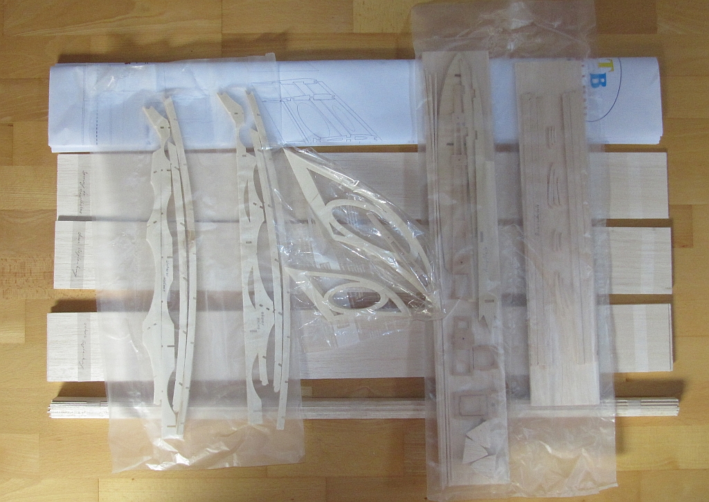 Einen so sauber mit Liebe verpackten Baukasten habe ich selten gesehen. Alle Bauabschnitte sind einzeln eingeschweißt in Plastiktüten und sauber beschriftet. Selbst die Beplankungsbrettchen sind mit Tesa in einzelne Abschnitte aufgeteilt und auf das Tesa ist der jeweilige Abschnitt geschrieben.