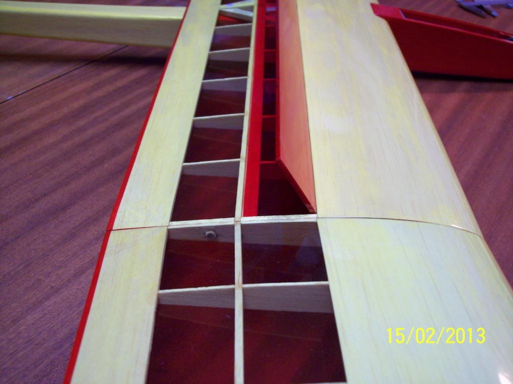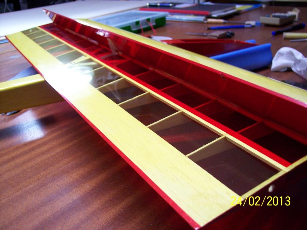 Eine Änderung werde ich noch beim Bespannen umsetzen: Vorgesehen ist, den Bereich unter der Störklappe nicht zu bespannen. Nach Rücksprache mit Ruben hat das auch aerodynamisch keinen Einfluß. Ich werde jedoch die Folie auch dort durchziehen, da sich aus meiner Erfahrung nach Landungen auf Gras (auch auf Golfrasen) sich im Laufe der Zeit allerlei Zeugs und Getier im Modell wiederfinden und das sieht bei transparenter Bespannung nicht schön aus, bleibt aber Geschmachsache. Dazu ist unmittelbar an der Hinterkante den oberen Beplankung eine Hilsleiste (etwa 3x3) zum Ankleben der Folie einzuziehen. Zugegeben, das macht etwas Mühe, dafür hat man aber einen dichten Flügel.