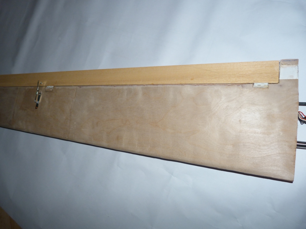 Das Projekt kam in die Ecke, bis ich den Rumpf beim GOOGLEN befunden habe. Die „alten“ Holm-Rippen-Flächen (1,0mmBalsa Beplankung) habe ich mit 0,6mm Sperrholz „aufgebügelt-aufgemotzt“, die Ruder sind durch Abachiendleiste asymmetrisch 1000x15x50mm ersetzt und die ganze Sache so gut es geht dem neuen Rumpf angepasst.